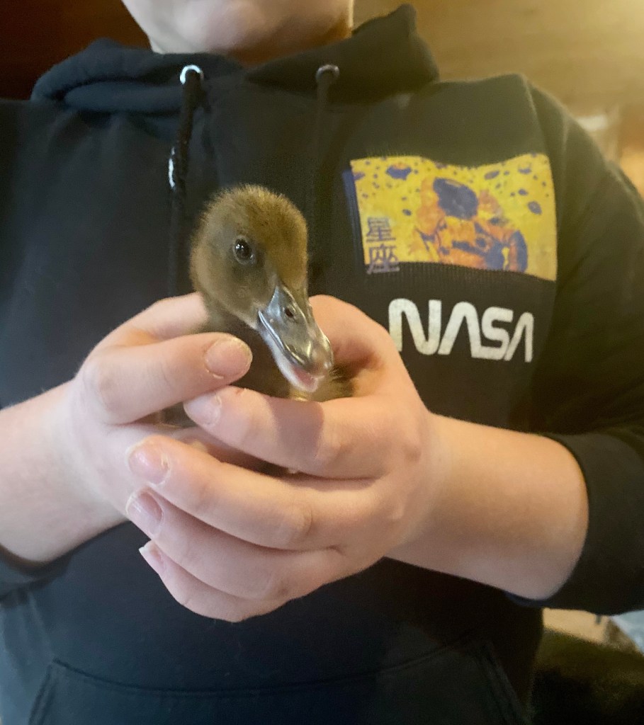 Lucky was rescued by our friend Theresa’s daughter Hunter. After living in Hunter’s dorm room for a couple of weeks we were asked if we could take Lucky the duckling in. We had just gotten three baby ducks so it was the perfect time. One duckling didn’t make it. However, Lucky, Dante, and Beatrice were the three amigos until Beatrice got broody and was taken by a predator when she was guarding her clutch of eggs.