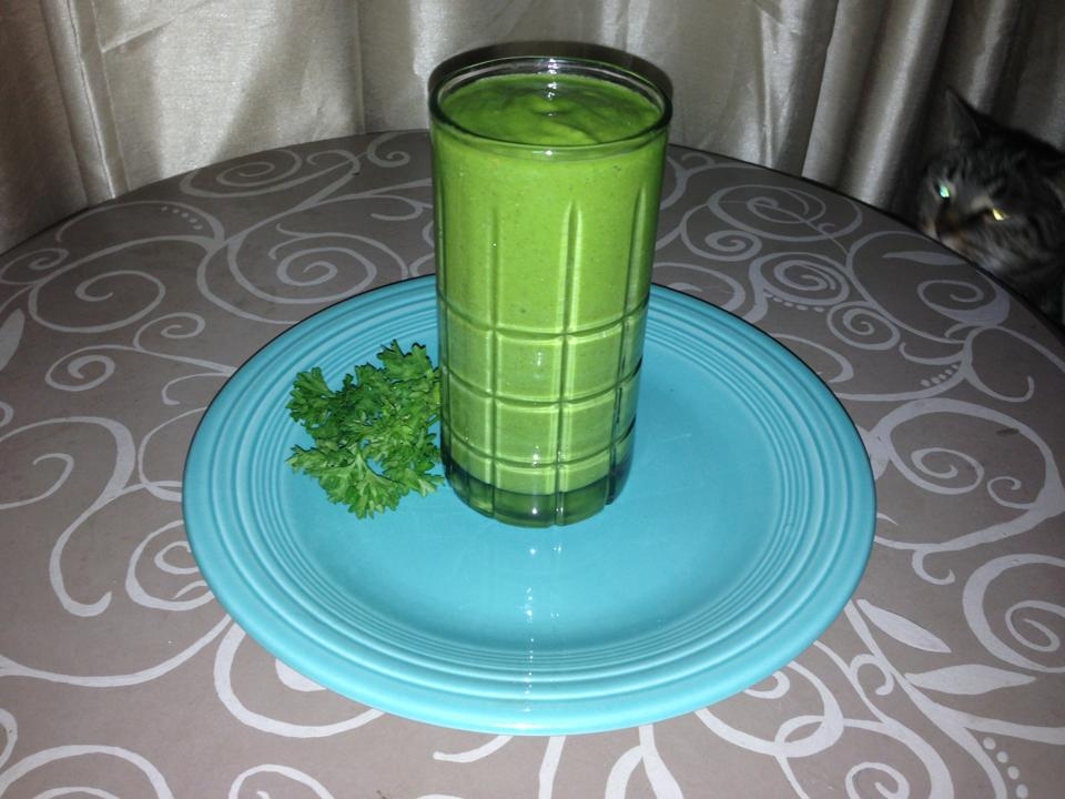This morning was not a typical Sunday in our house. Before the coffee maker even began to gurgle our Vitamix broke the silence. Two glasses of liquid mirth were poured and with the first sip my taste buds began a spirited dance. The combination that I whirled together was so phenomenal that this evening I blended a second smoothie and captured pictures for this post. One thing that I quickly learned about becoming a food photographer is that I have to be prepared to take many shots. (Please excuse my feeble attempts and I hope to advance my skills as this blog progresses.) Another thing I learned is that my cat Athena really fits the curious reputation that cats hold. The other morning as I was photographing my green smoothie with my iPhone to share with my facebook friends, Athena performed a perfectly orchestrated photo bomb.