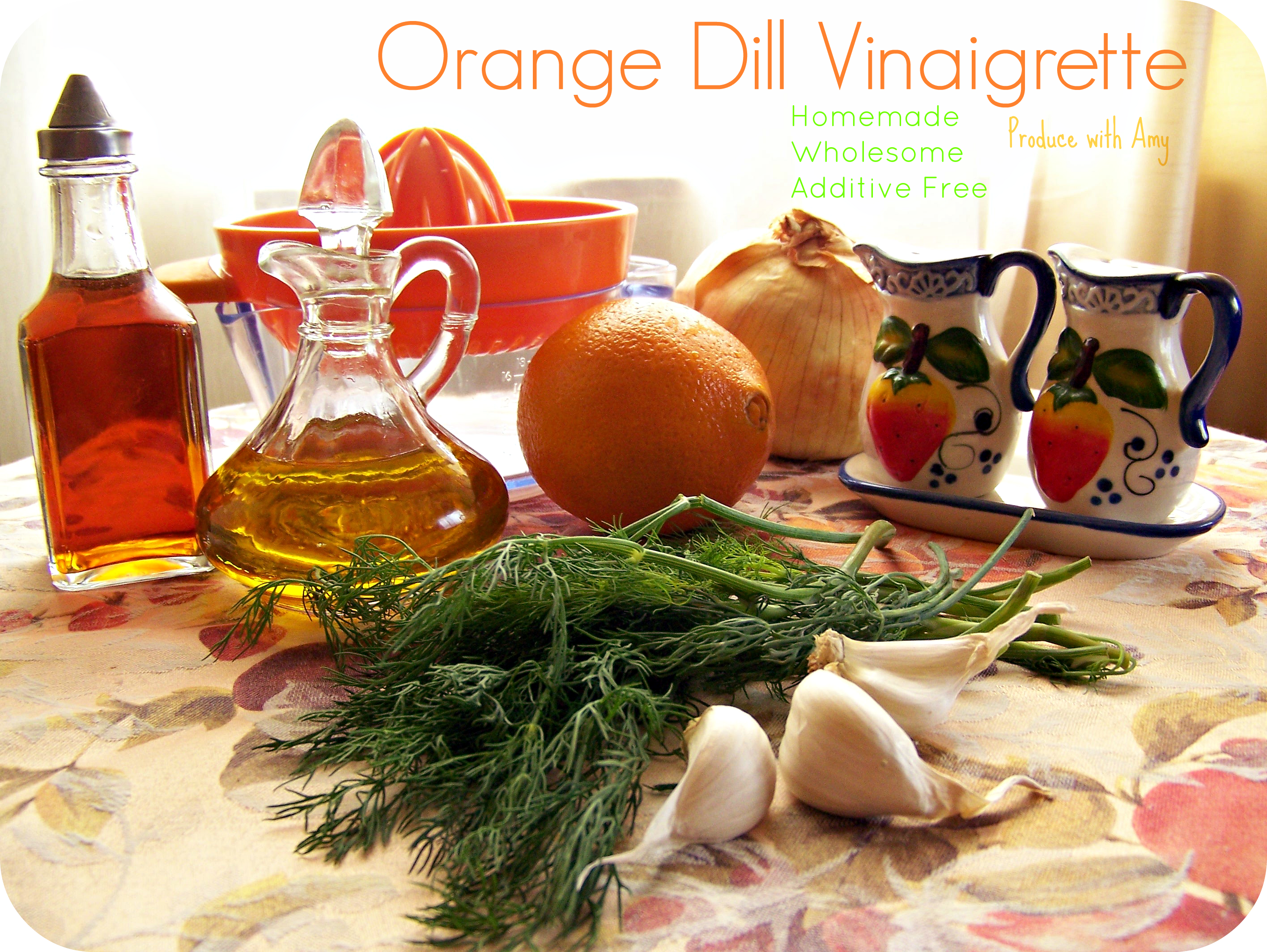 I hope you enjoy the Orange Dill Vinaigrette dressing as much as I do. Please join the conversation by “liking” my Produce with Amy facebook group. Recipe reviews are always appreciated and let me know what kind of recipes interest you. I love being able to help others maximize their health and productivity by eating more fresh fruit and vegetables. Cheers to additive and preservative free salad dressing, the bounty of summer, and thriving!