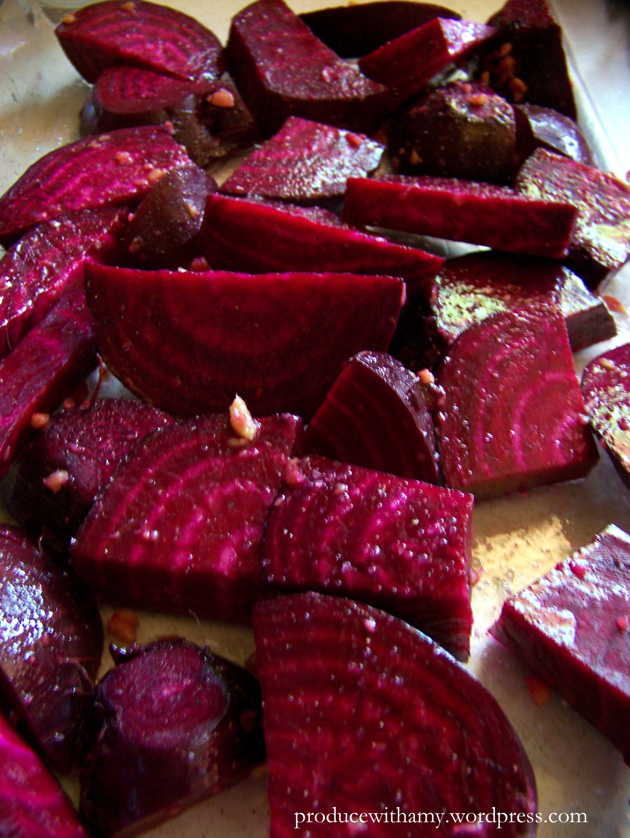 The beets that I bought were large so I cut them into many pieces. I scrubbed them well and left the peelings on. If you have smaller beets you can cut in 1/2 or thirds. Once they are done roasting the peels will slide right off. I roasted these beets for 40 minutes at 450 degrees. I opened the oven after 20 minutes and gave them a toss. I let the beets cool before making the salad.