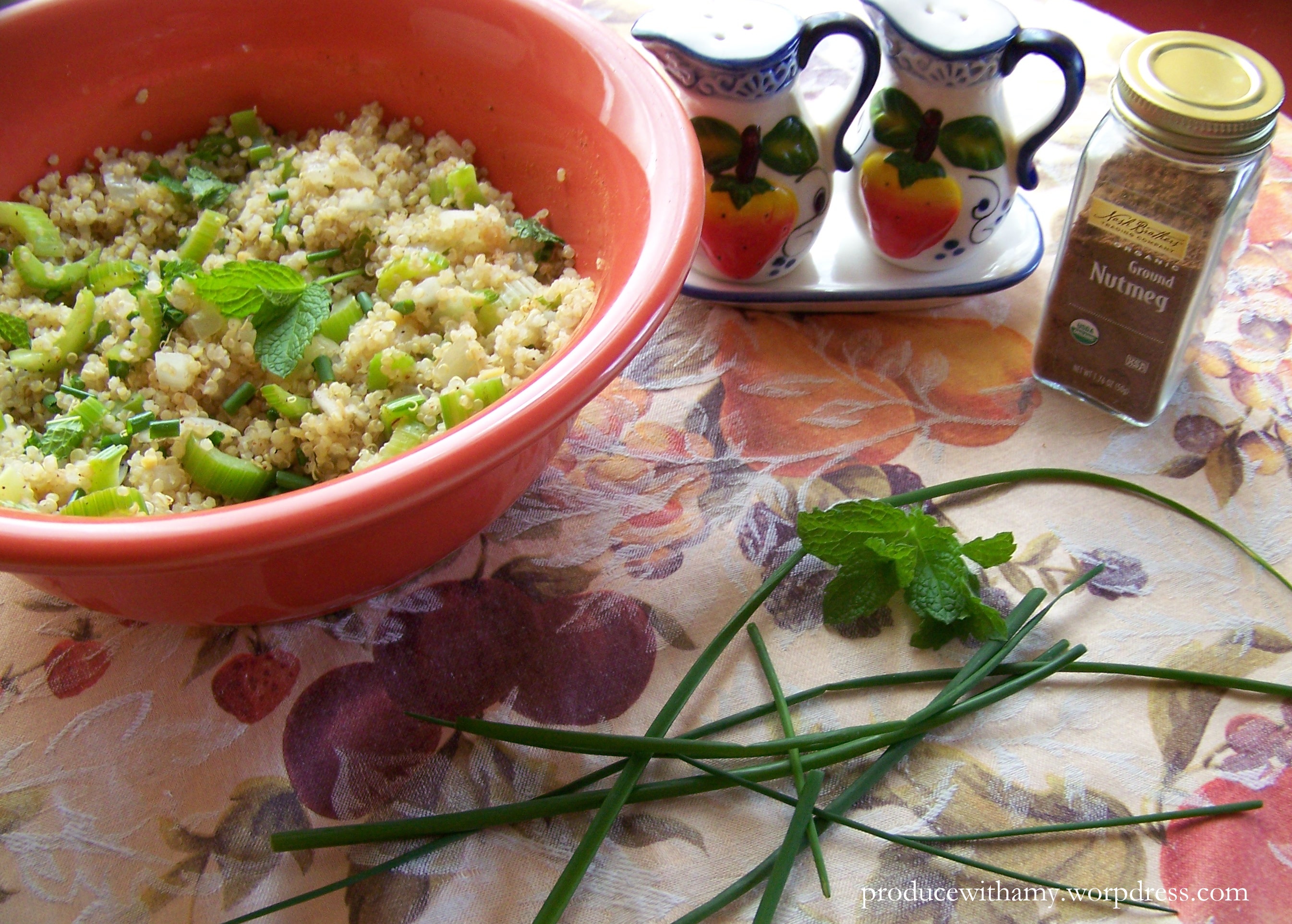 Add nutmeg, mint, and chives and stir. Salt and pepper to taste.