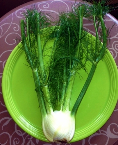 was first drawn to fennel in the supermarket. The bright green fronds (even though I do not eat them) make for a pretty composition. If you have never had fennel before I challenge you to try it. It has a very mild anise flavor and is common in Mediterranean dishes. It can be eaten raw or cooked and I love it sliced thinly on a green salad with orange and grapefruit segments.