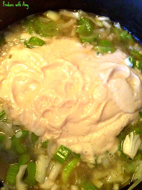 Saute the onion, celery, and garlic in coconut oil until soft. Puree the cauliflower and white beans in a blender with a couple of cups of the vegetable stock until silky smooth. You can puree the onion, celery, and garlic too but I like to leave them whole.