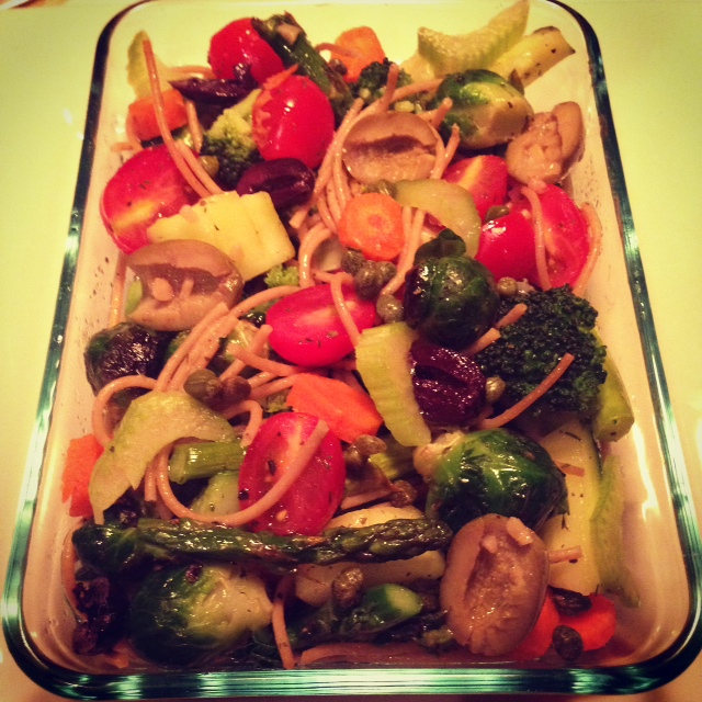 In May I started making bento-styled lunches in three cup Pyrex containers. Instead of making Mason jar salads a week in advance, I would use the leftovers from dinner and other vegetables that I had on hand and make a couple at a time. I would drizzle with homemade dressing, and like always, I would add two teaspoons of extra virgin olive oil to each salad for portion control.