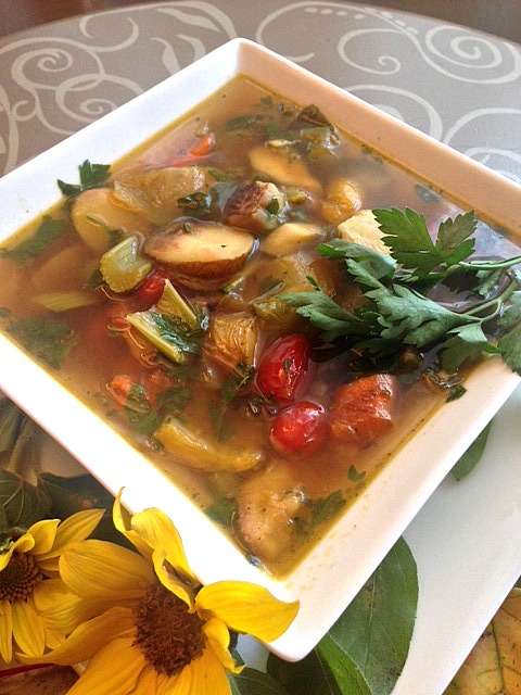 Bring vegetable stock, roasted garlic, and fresh rosemary and thyme to a boil. Simmer for 15 minutes. Add all the roasted vegetables and simmer for 20 minutes. Remove from heat and add lemon juice and zest and stir in chopped parsley.