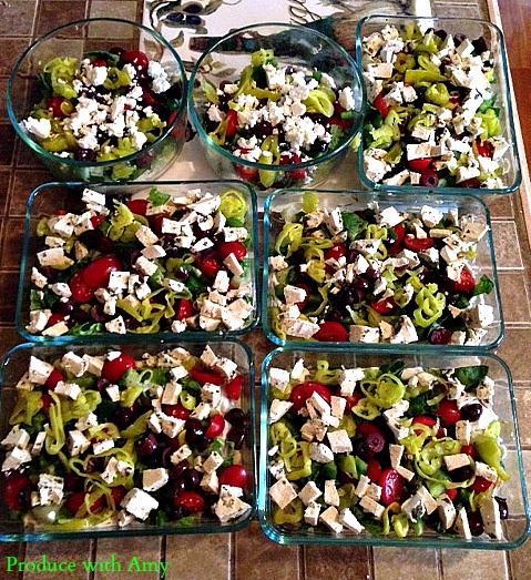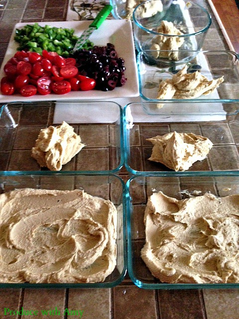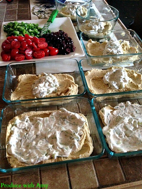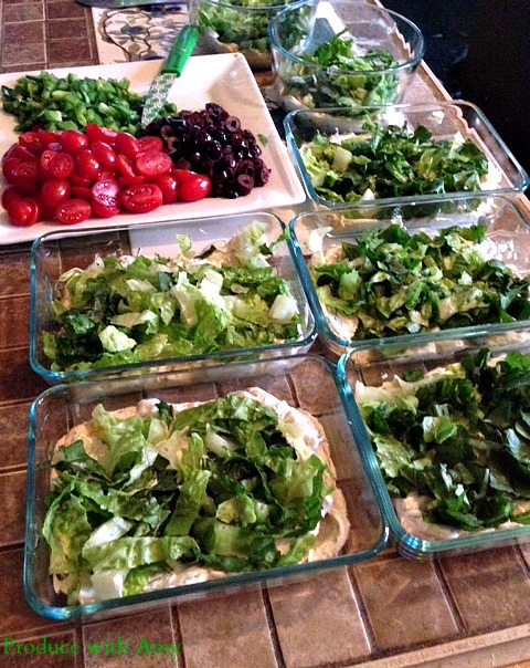 Layer the following in your containers. You can decide how much of each ingredient you want to add. I added 1/4 cup of hummus into each dish and divided the tzatziki sauce up between the seven containers.