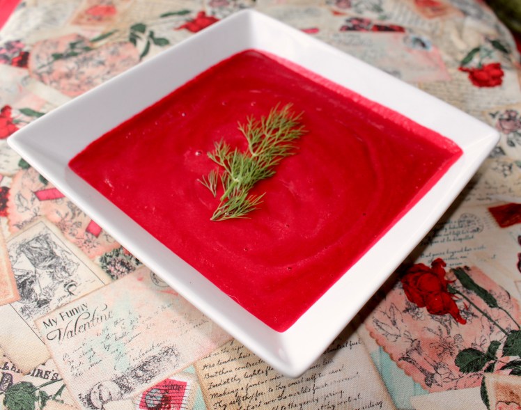 Beets are one of those vegetables that people seem to either love or hate. I grew up adoring my mom’s pickled beets and as I grew older I enjoyed roasted beets as a side or in a salad. While it is an acquired taste (my husband did not enjoy this recipe and he does like beets). I thought that I would share a recipe for you that uses this root vegetables as a main ingredient. This dish would be a perfect starter course for a romantic Valentine dinner. Afterall, beets are earthy, sensual, and when roasted take on a sweet taste and luscious texture. The color of this pureed soup is exquisite and begs to be ladled into a pretty bowl with a backdrop of glowing candles and soft music. Corny? Perhaps. However, trust me, if soup can be sexy – this one is! If only my husband John would agree. 😉