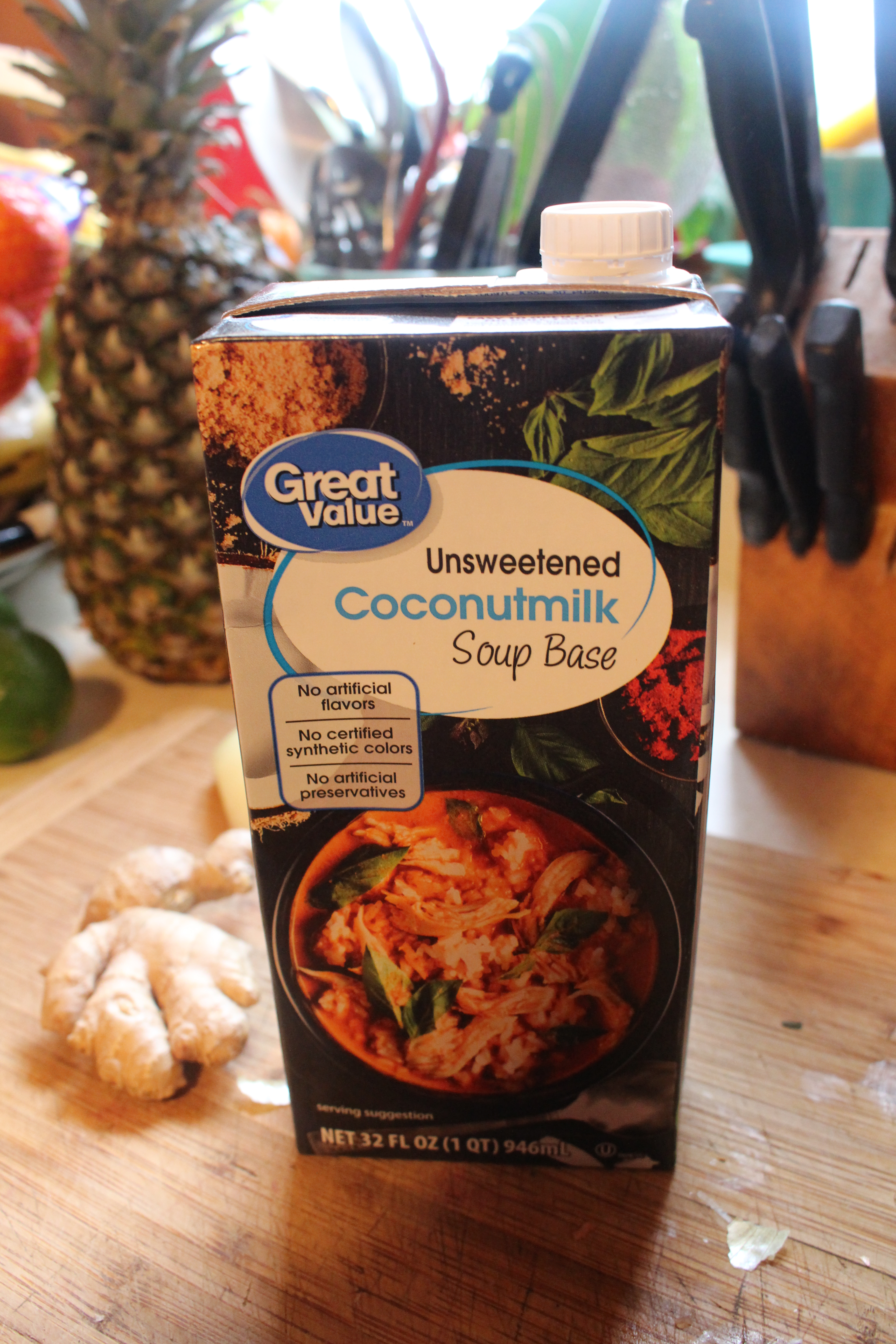 *4 cups of coconut milk soup base (I found locally in Wal-Mart. You can substitute four cups of vegetable or chicken broth and ½ can of coconut milk from the Asian food section)