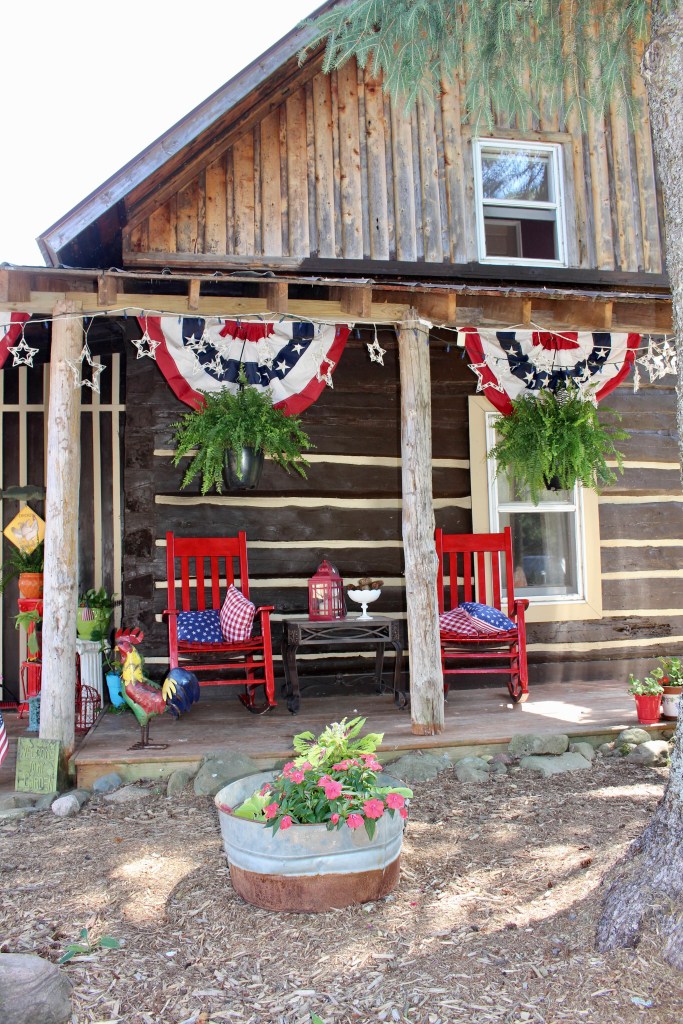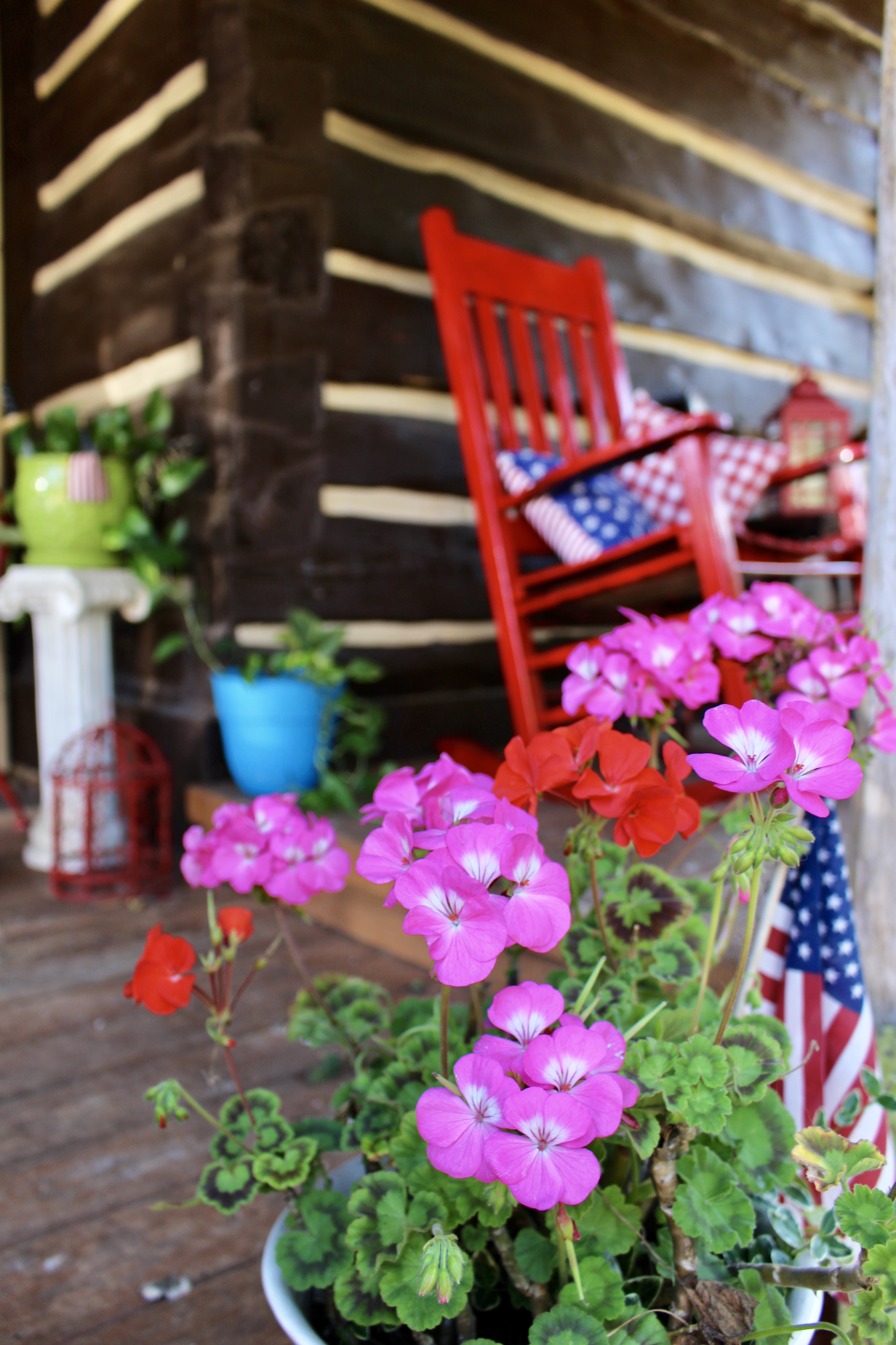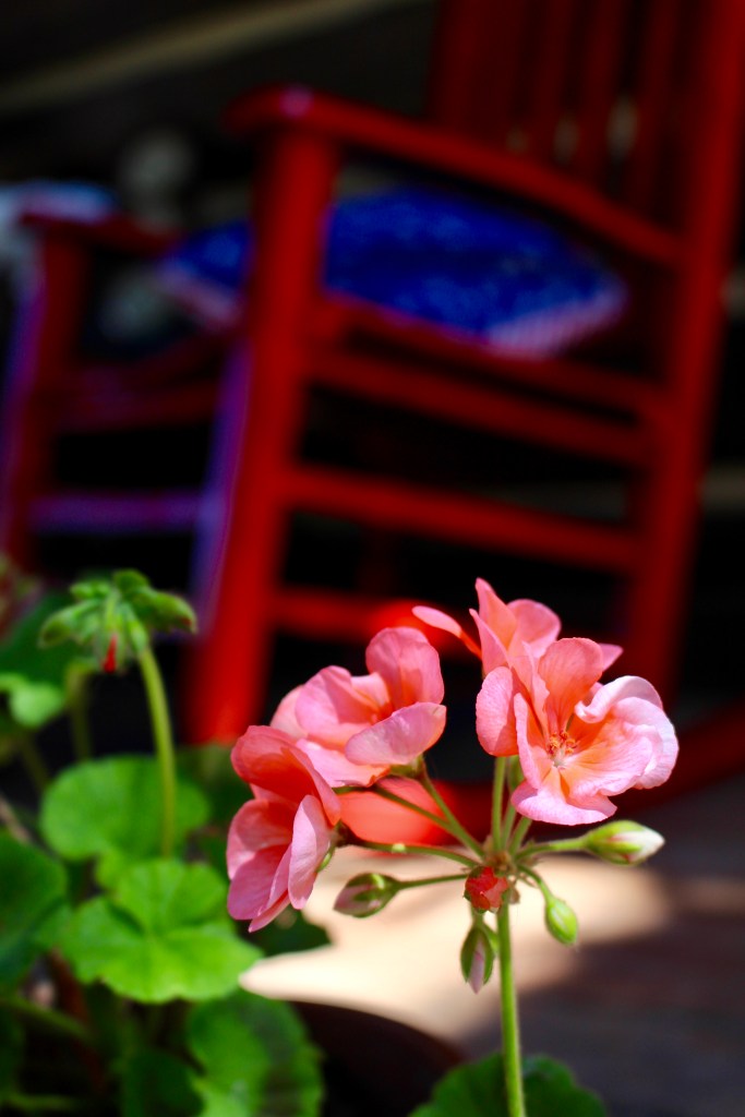 Last summer I painted the rocking chairs bright red. I also love adding color with pots and collected treasures. In the summer I haul out the house plants, and because I am thrifty, I winter the ferns and geraniums. Last year I potted hostas in pots and they did lovely on the porch that gets plenty of shade. I then planted them around the pool in the fall (there’s always a spot for a hosta).