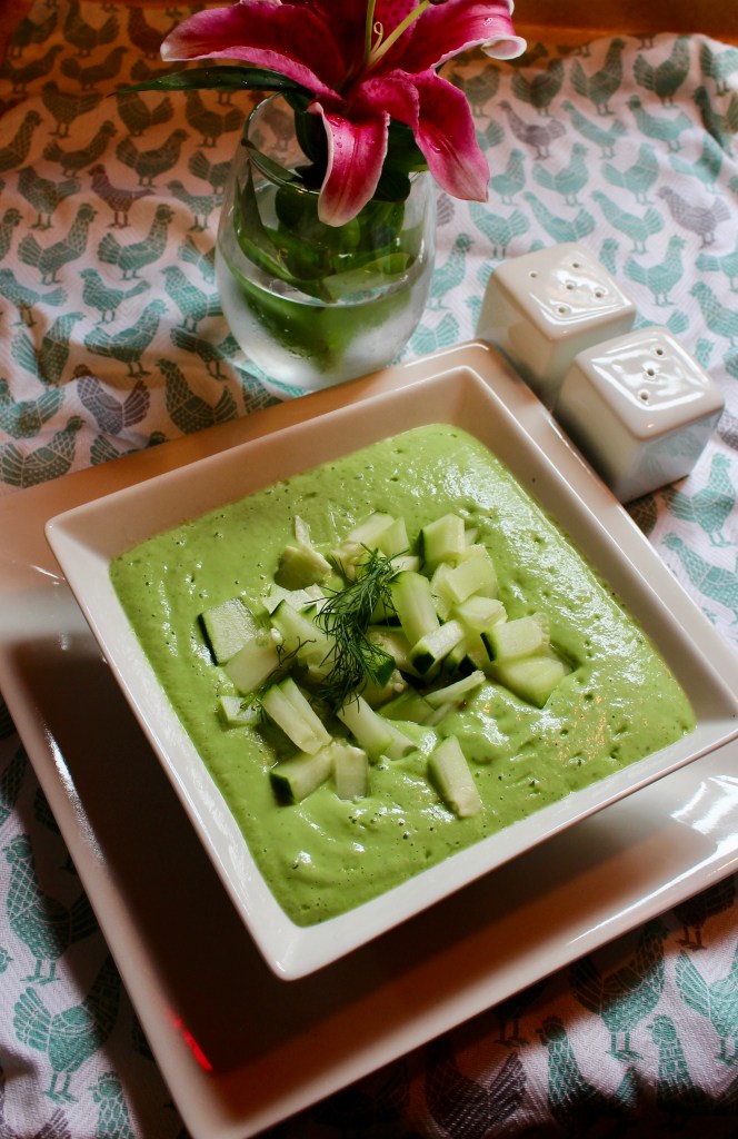 As I tried to come up with different ways to serve up crunchy slices of cucumbers, I often joked that I needed to come up with a cucumber cookbook. While my eleven-year-old step daughter Avalon’s favorite way to enjoy cucumber is putting them on her eyes to pretend she is at a spa, I think one of my favorite ways is a cool and refreshing bowl of cucumber soup. In fact, this time of year I find myself yearning so much for summer that I make sure that I pick up the ingredients at the supermarket so I can whip up a batch.