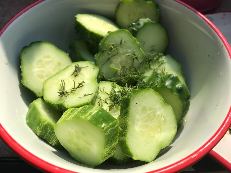 If it is a garden cucumber, or organic from the market, I only remove ½ of the peelings. Cut the cucumber in half and with a spoon remove the seeds (they make the soup too runny). Chop and reserve ½ of the cucumber. Add the other half of the cucumber and the rest of the ingredients to a blender. Do a quick blend if you want the soup to be chunky and longer if you want it smooth. Pour in a bowl and add the chopped cucumber to the top and a sprig of fresh dill.