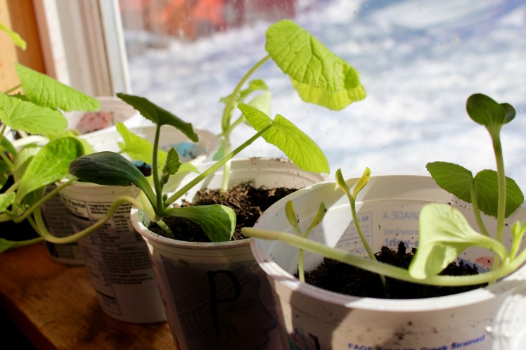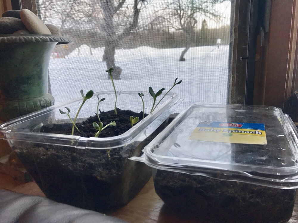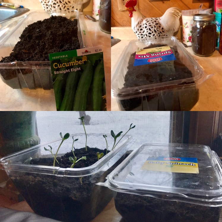Since my family is fortunate to have a hoop house, April will be planting season for us and we are investing a lot of sweat equity into our garden this year. For a couple of months now we have been starting seeds in our house. My husband John started broccoli, Brussels sprouts, pumpkin, watermelon, and an assortment of flowers. Last weekend I started tomatoes and cucumbers. Check out the “mini-greenhouses” I used to plant cucumbers and recycle the large clamshell containers that greens come in from the supermarket.