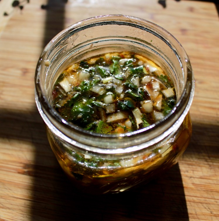 Normally, when I make dressing, I use my Vitamix blender. However, for this dressing, I wanted a chunkier consistency so I added all the ingredients into a pint-sized mason jar, put the lid on and gave it a good shake.
