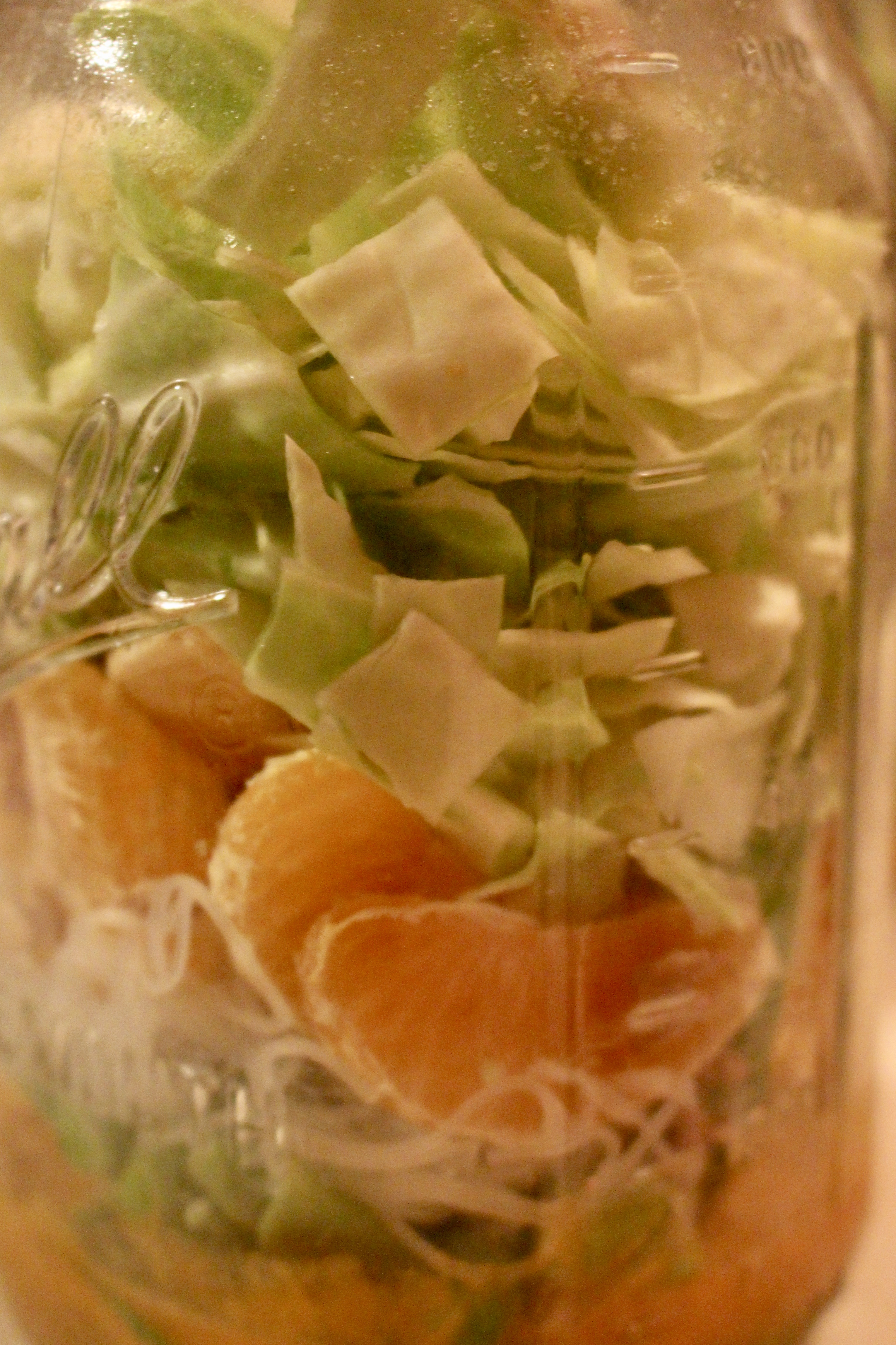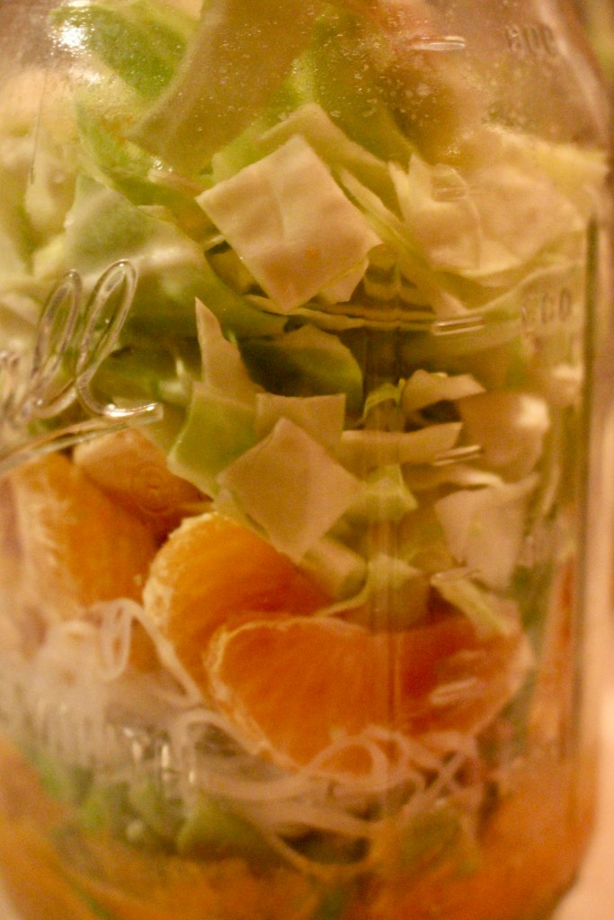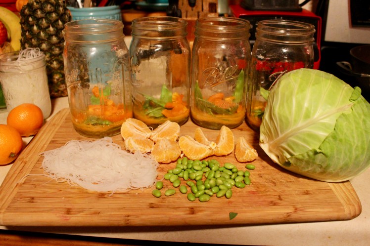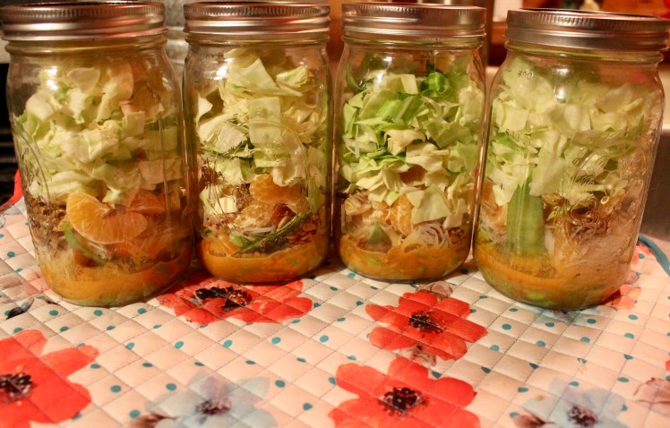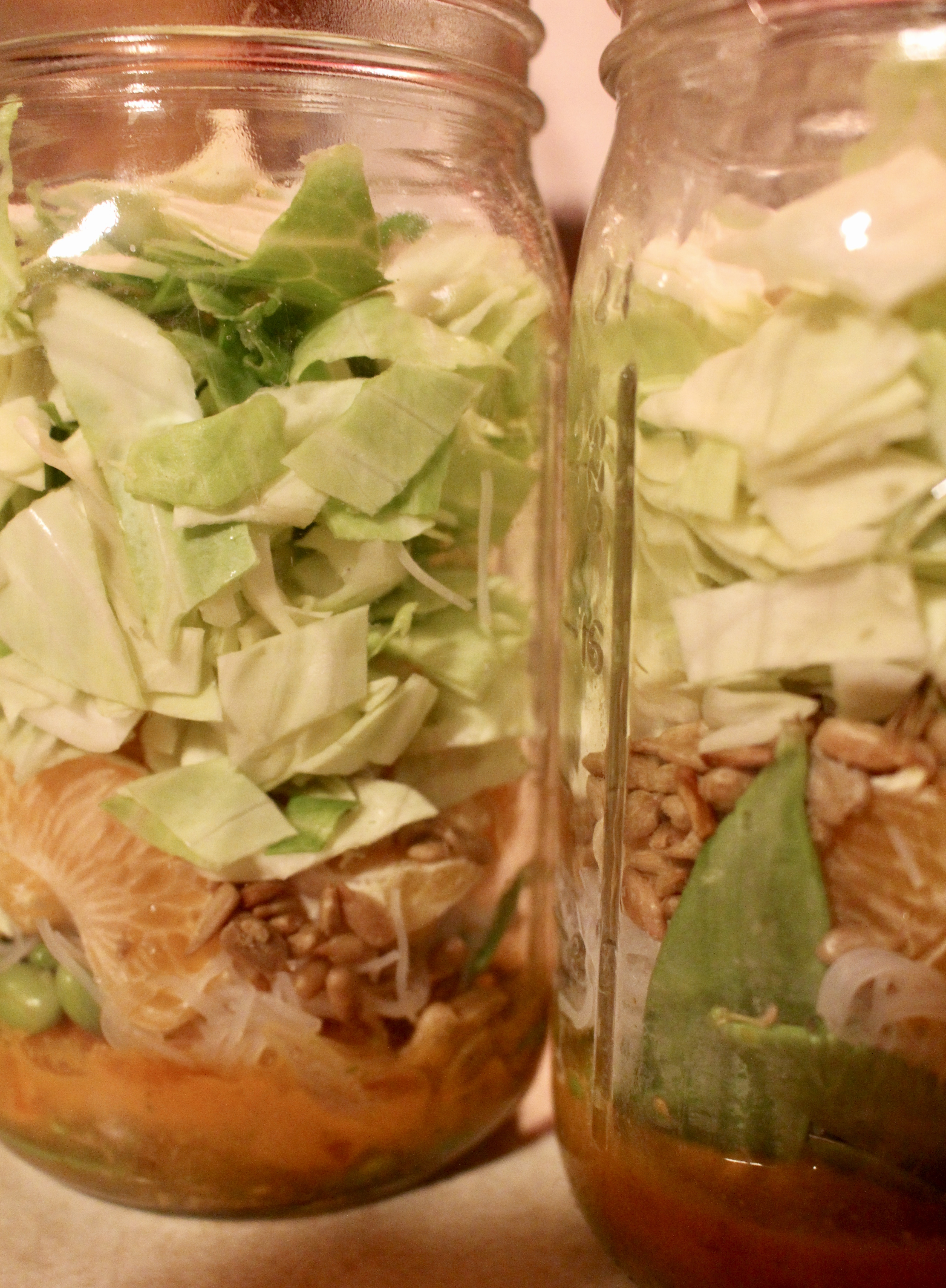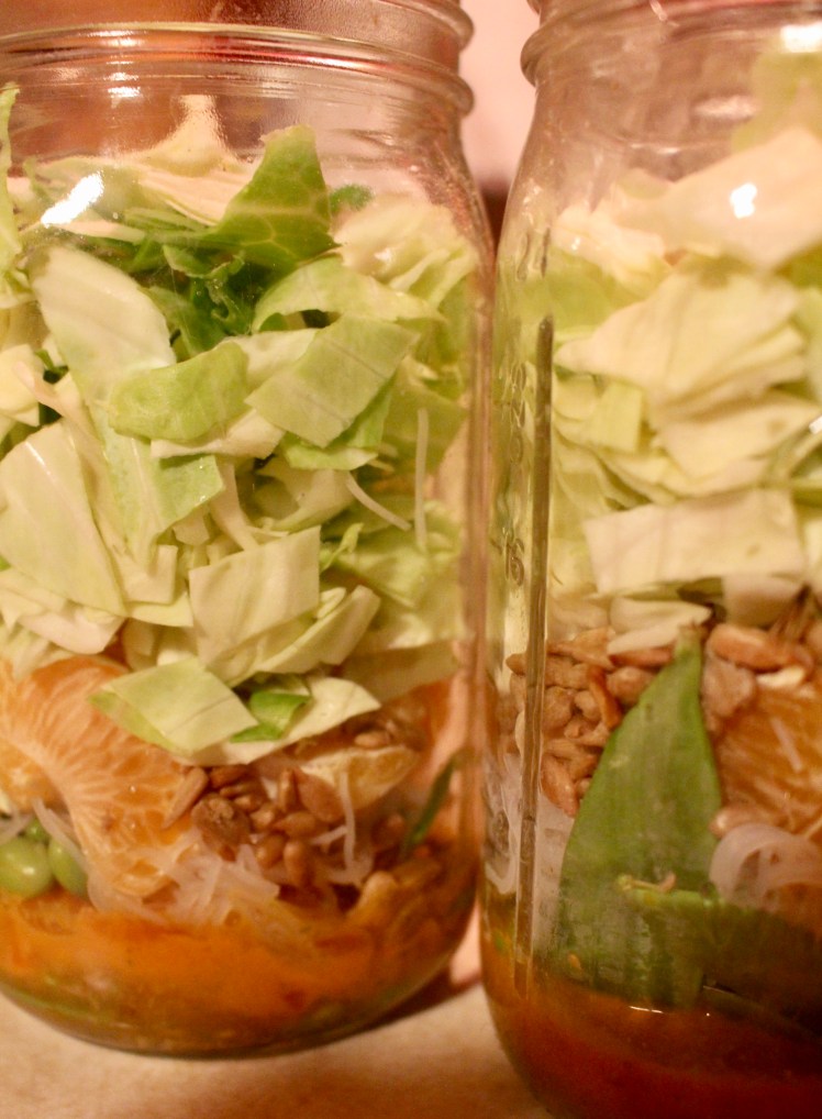 I made four salads using quart Mason jars. You can decide how much of each ingredient to add. I used ¼ cup each of sunflower seeds, noodles, and edamame. I divided up one small bell pepper, used one clementine per jar, and filled the rest with crunchy cabbage (packing it well to ensure the salad had enough cabbage). Red cabbage works well with this salad as do carrots, tomatoes, broccoli – and if you eat meat you can add chicken or shrimp.