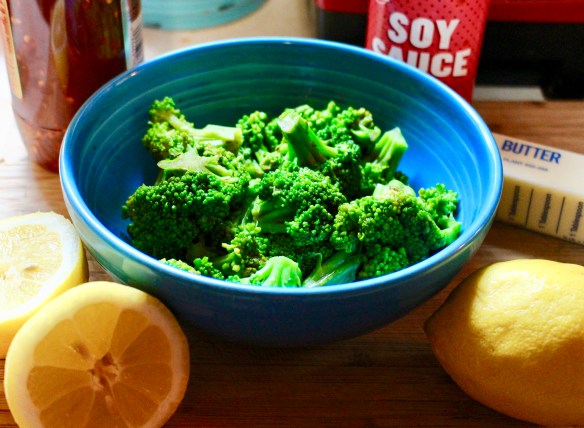 Prepare the broccoli with your favorite method. When I use fresh I use the blanching method and with frozen I cook in the microwave for 3-5 minutes (depending on the amount I use). In a bowl add the lemon juice and zest, soy sauce, chili paste, garlic, and butter (the hot broccoli will melt the butter) or olive oil. Toss and serve warm.