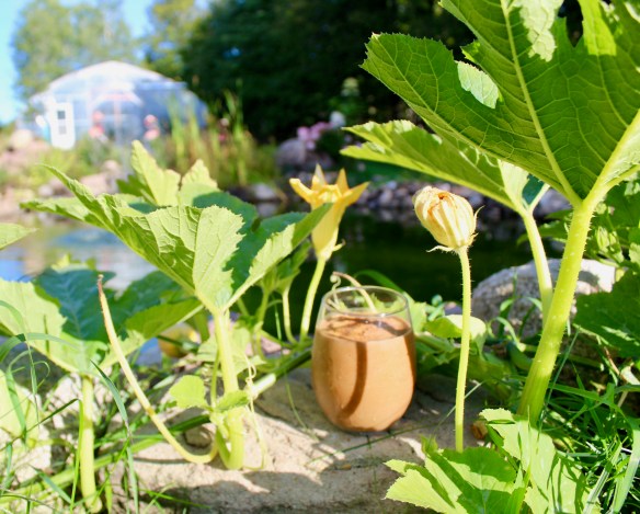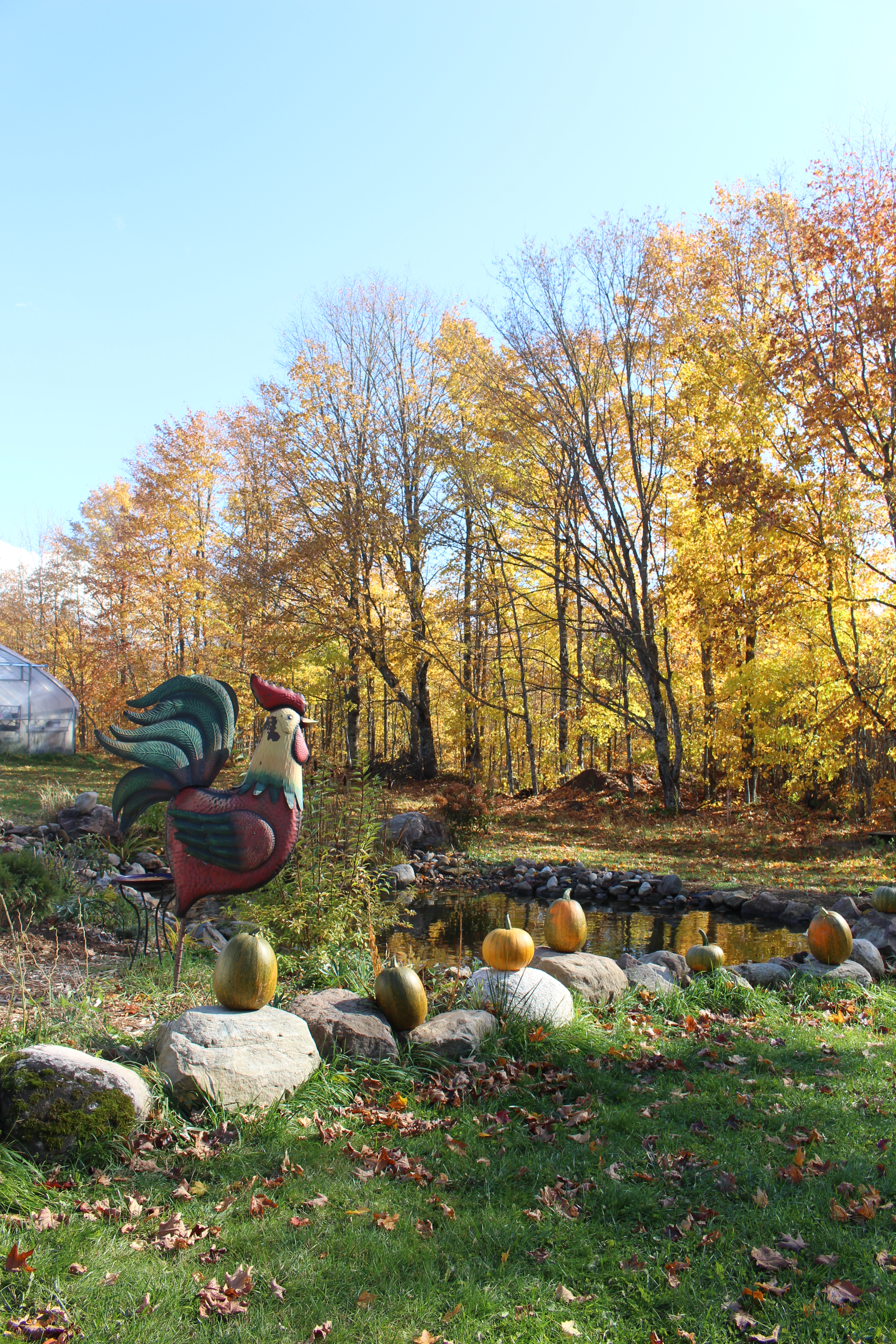 While I am not one to get all giddy over pumpkin flavored lattes, I do enjoy pumpkin in recipes. Last year I learned by accident that pumpkins are quite easy to grow. I planted a few pumpkin seeds at the bottom of our duck pond and their vines thrived. The pond is rimmed with rocks from our property and I think that the pumpkin plants do well because the rocks collect warmth from the sun. Not only am I able to grow several pumpkins from only a few seeds, but the foliage is lovely and softens the edge of the pond and the flowers provide a pop of ornamental color. This year I made sure to plant pumpkins that are recommended for their culinary flavor and texture.