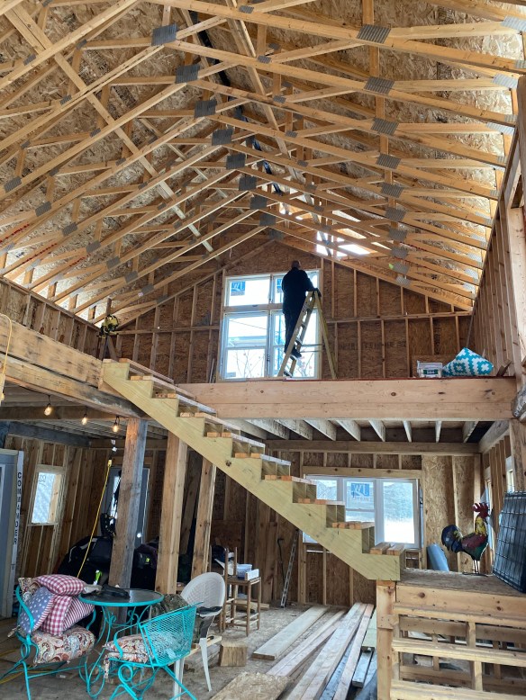 Oh my, check this out! He installed the windows today for the window seat in our loft. π These windows overlook our orchard, the hoophouse, pasture, and upper pond (which John is going to dig deeper and add a section for koi). The loft will house my library of poetry books, a sleeper sofa, a bathroom, and be a cove of creativity and relaxation.