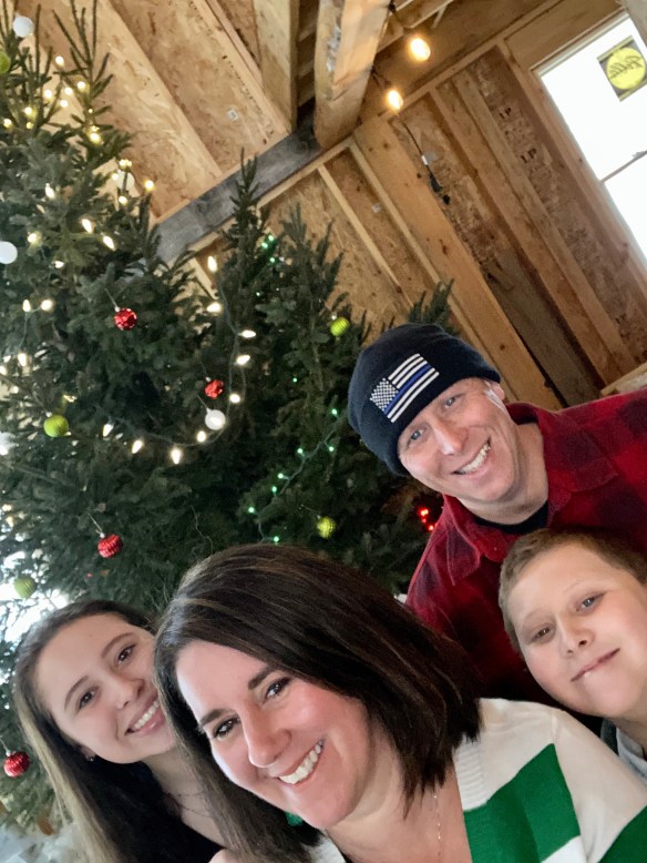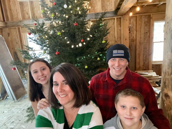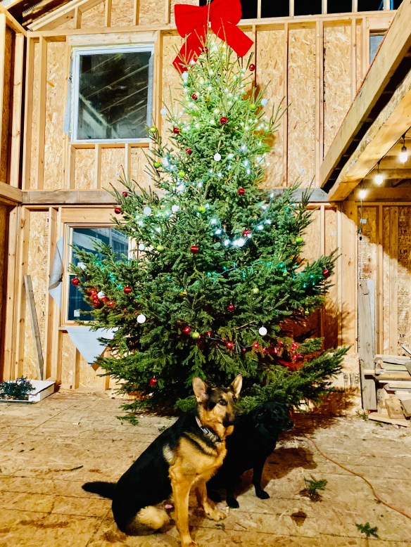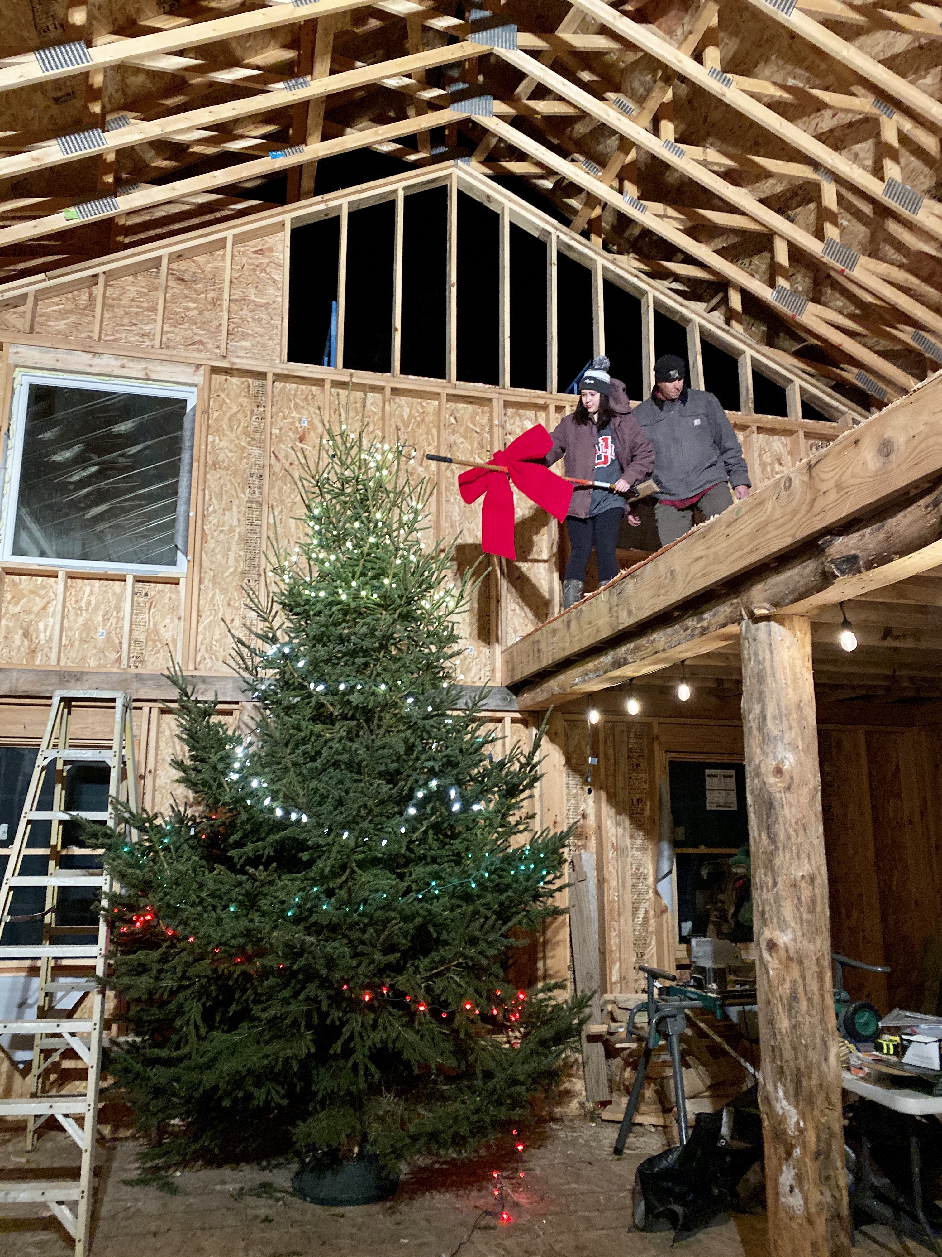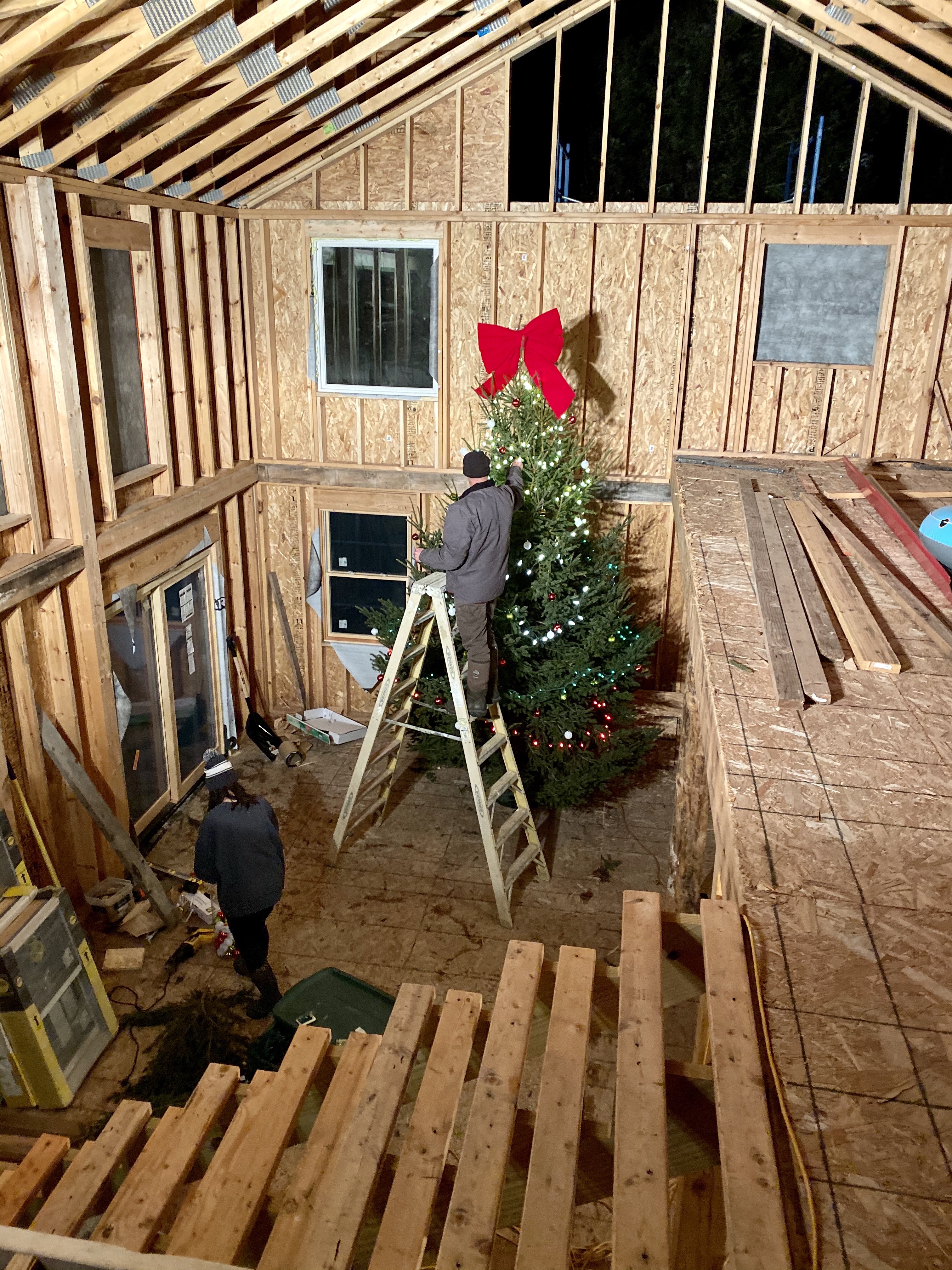 We hope to be living in our addition by this summer, but we still wanted to celebrate the space with something special for the holiday season. John cut a 17+ foot tree down from our property (he trimmed a few feet off) and he put it up in the addition. John and his daughter Avalon trimmed the tree with lights and giant red bow (we also added a few ornaments).