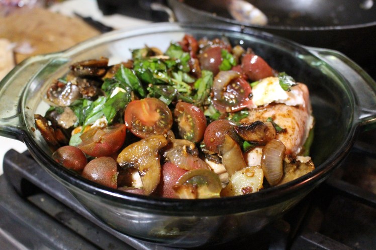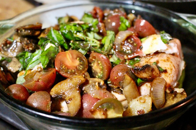While this chicken can be grilled (and finished later with the caprese toppings) I like to brown it first in a pan and then finish in the oven so the juices soak into the bed of vegetables. If you are not a fan of poultry, you can substitute steak or fish. If you are vegetarian a large portabella mushroom cap makes a delightful substitute. For the starchy carb watchers, you can replace the potatoes with cauliflower, broccoli, or even Brussels sprouts. Olives also make a great addition to this dish.