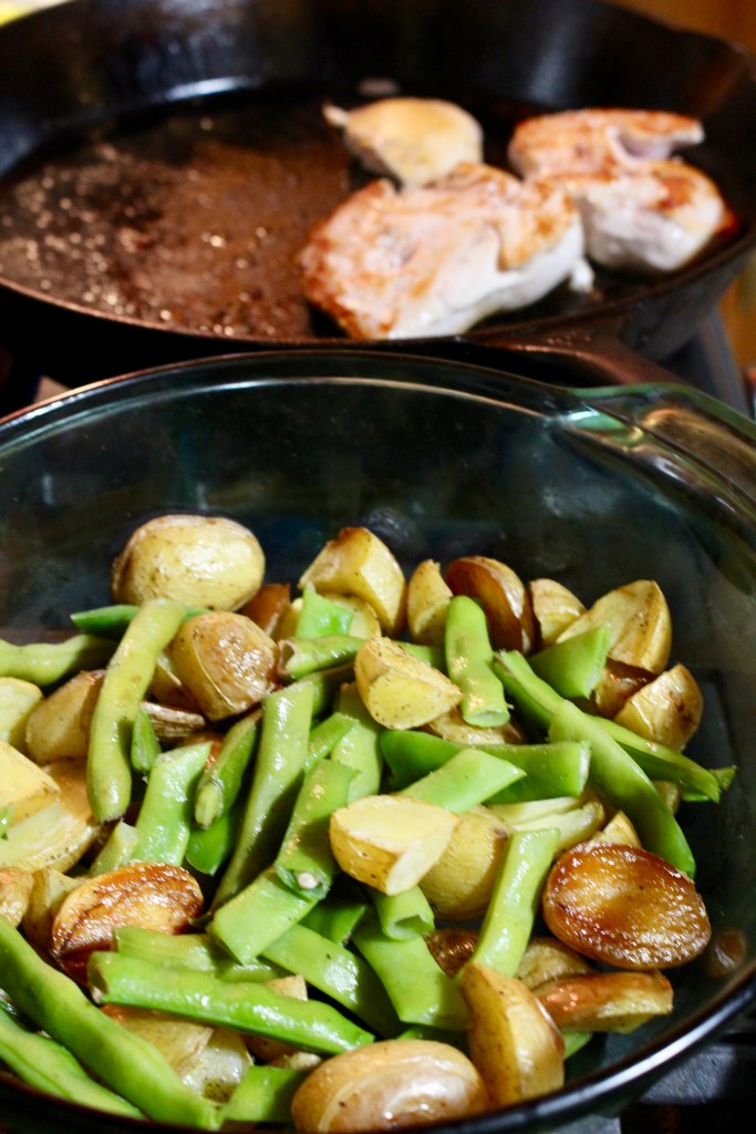 Preheat your oven to 450 degrees. In a baking dish drizzle the potatoes and beans with olive oil and salt and pepper. Start roasting the vegetables (approximately 15 minutes). When the 15 minutes are up, set aside.