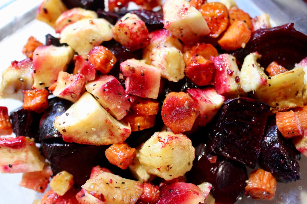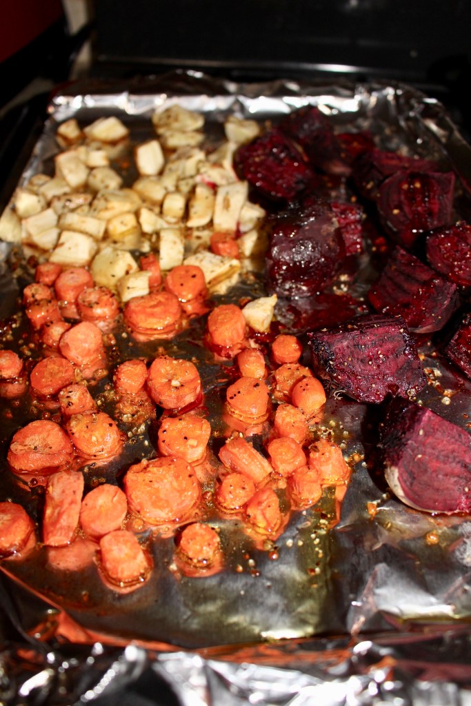 Cover a baking sheet with tin foil (for easy clean up) and toss the root vegetables with a drizzle of olive oil, salt, pepper, and garlic powder. Roast for 20-30 minutes at 450 degrees (time may vary depending on your oven). After 10 minutes give them a toss. Let the vegetables cool before making the salad. They can be prepared the day before.