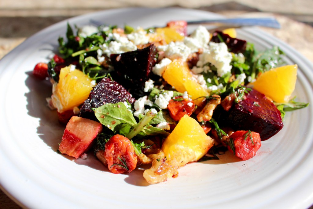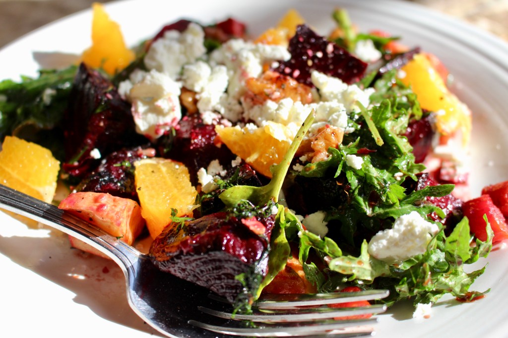 ROASTED ROOT VEGETABLE SALAD WITH BABY KALE, WALNUTS, & ORANGE DILL DRESSING