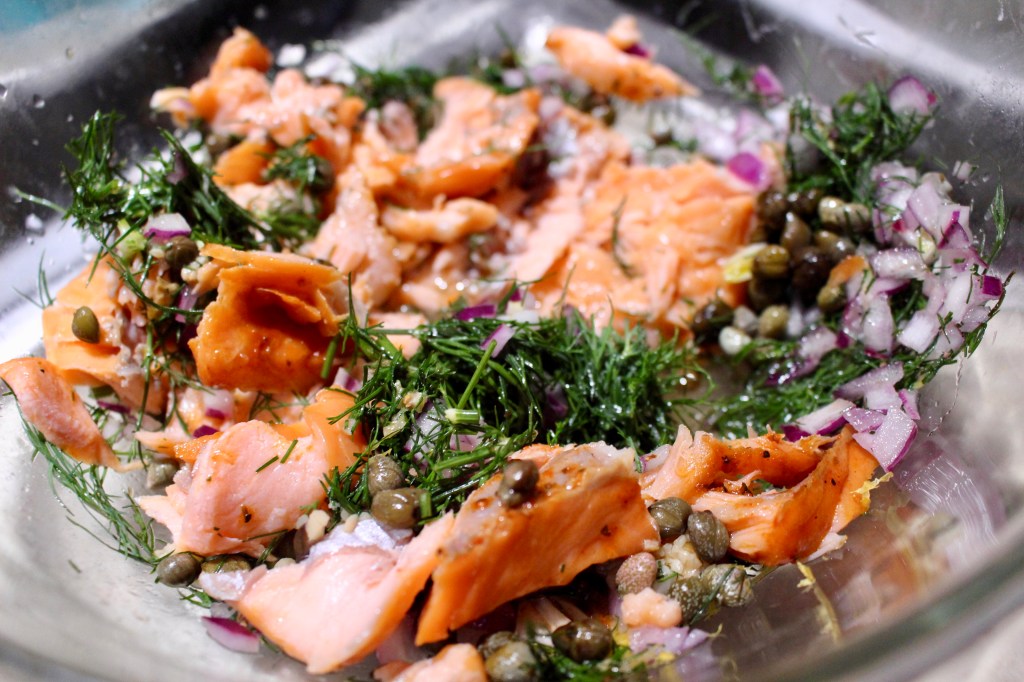 This salmon dip, or spread, is simple enough that you could make it while camping or traveling. It is wonderful as a dip for fresh vegetables, tortilla and pita chips, and is equally divine spread on crackers or a bagel. It is a fantastic dish to bring to a potluck or gathering and you will not have to worry about having leftovers. It serves as a great appetizer, midnight snack, or a luscious option for breakfast. In fact, the inspiration for this recipe is my #1 breakfast option at a favorite travel destination at the Chena Hot Springs near Fairbanks, Alaska. The bagel and lox at The Trail’s End Lounge is legendary.