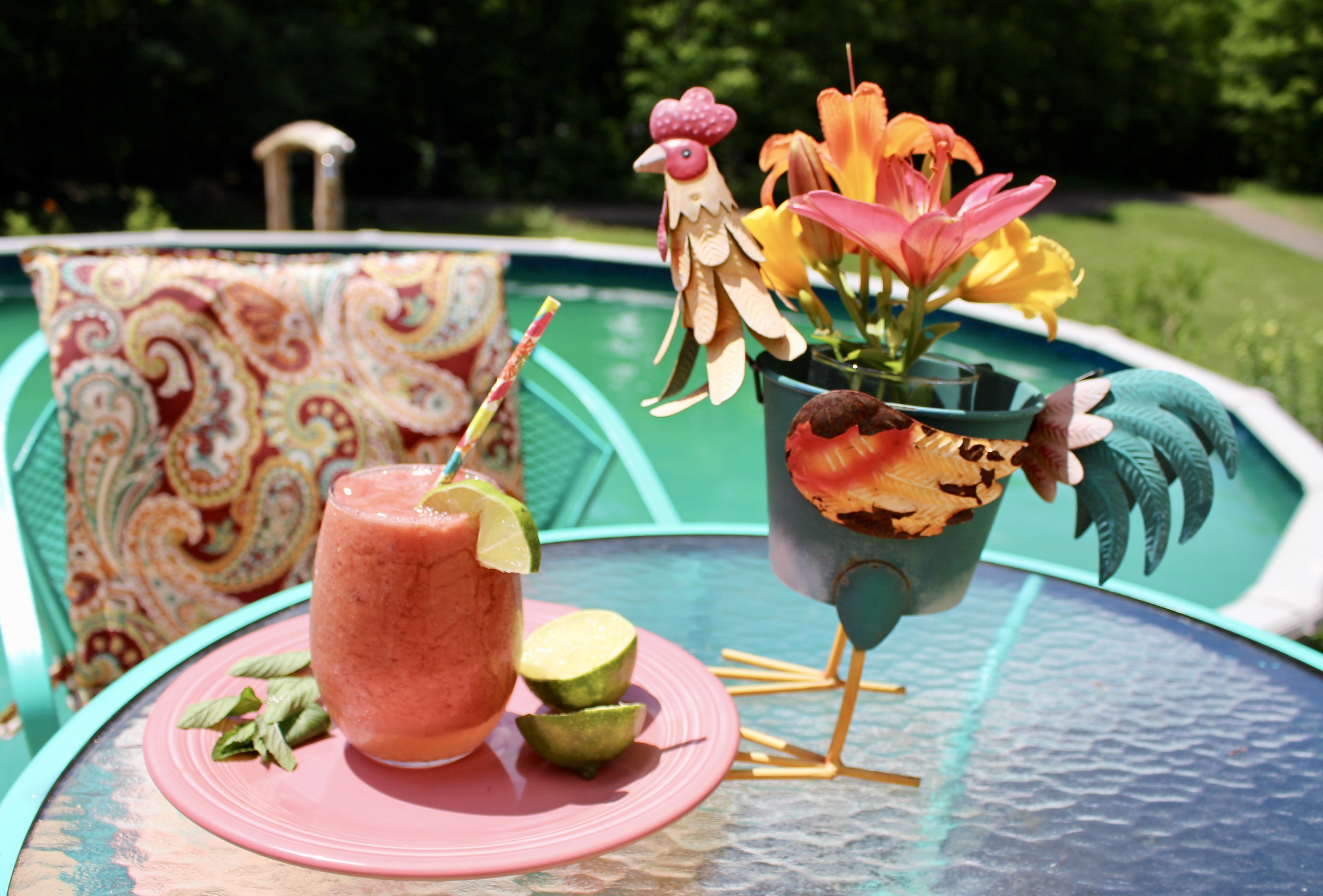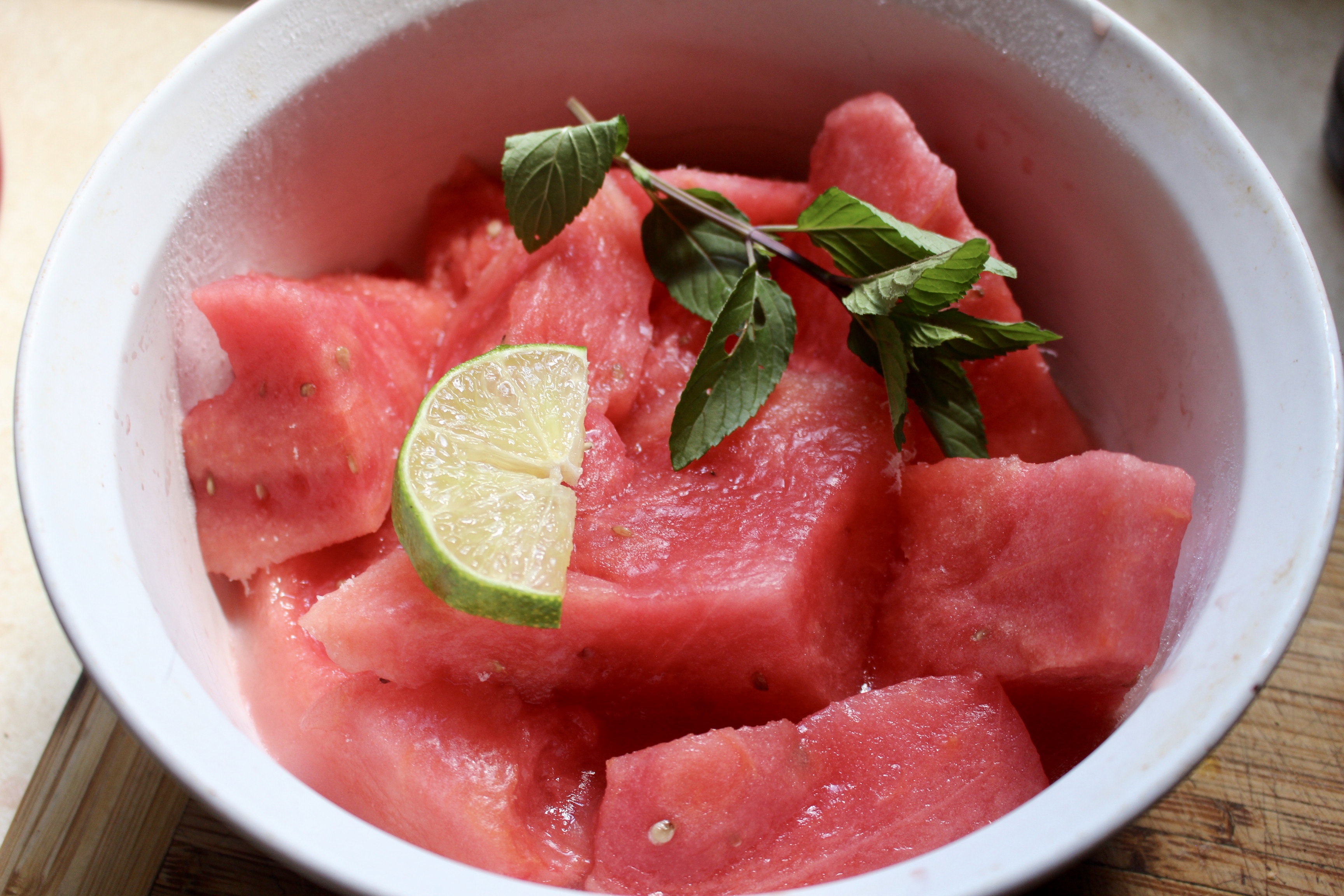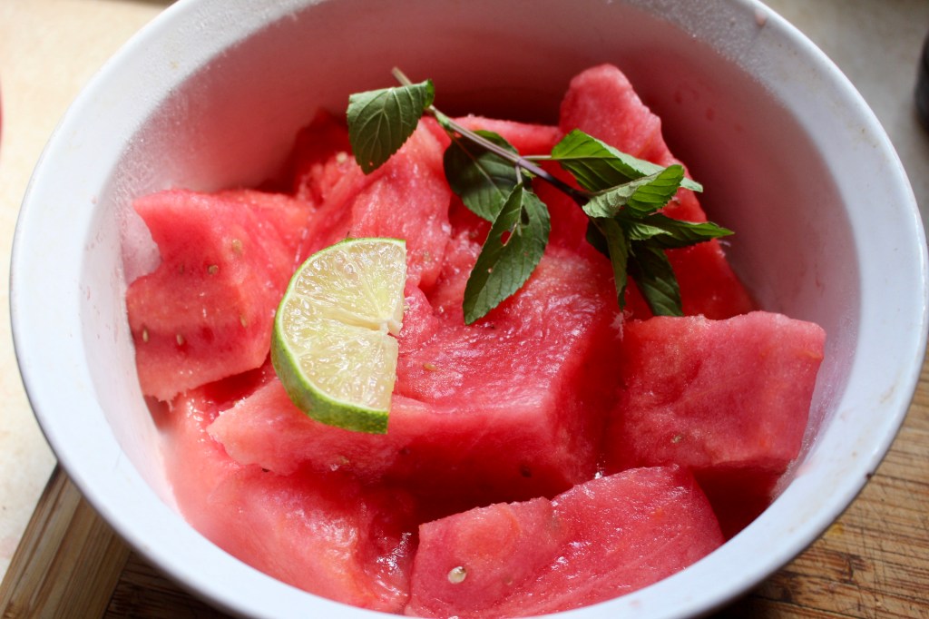 In addition to fresh cucumbers from our garden I like to always keep fresh watermelon on hand because it is such a refreshing and sweet treat when it is stifling hot outside. In addition, watermelon is high in lycopene (carotenoid phytonutrient that’s especially important for our cardiovascular and bone health).