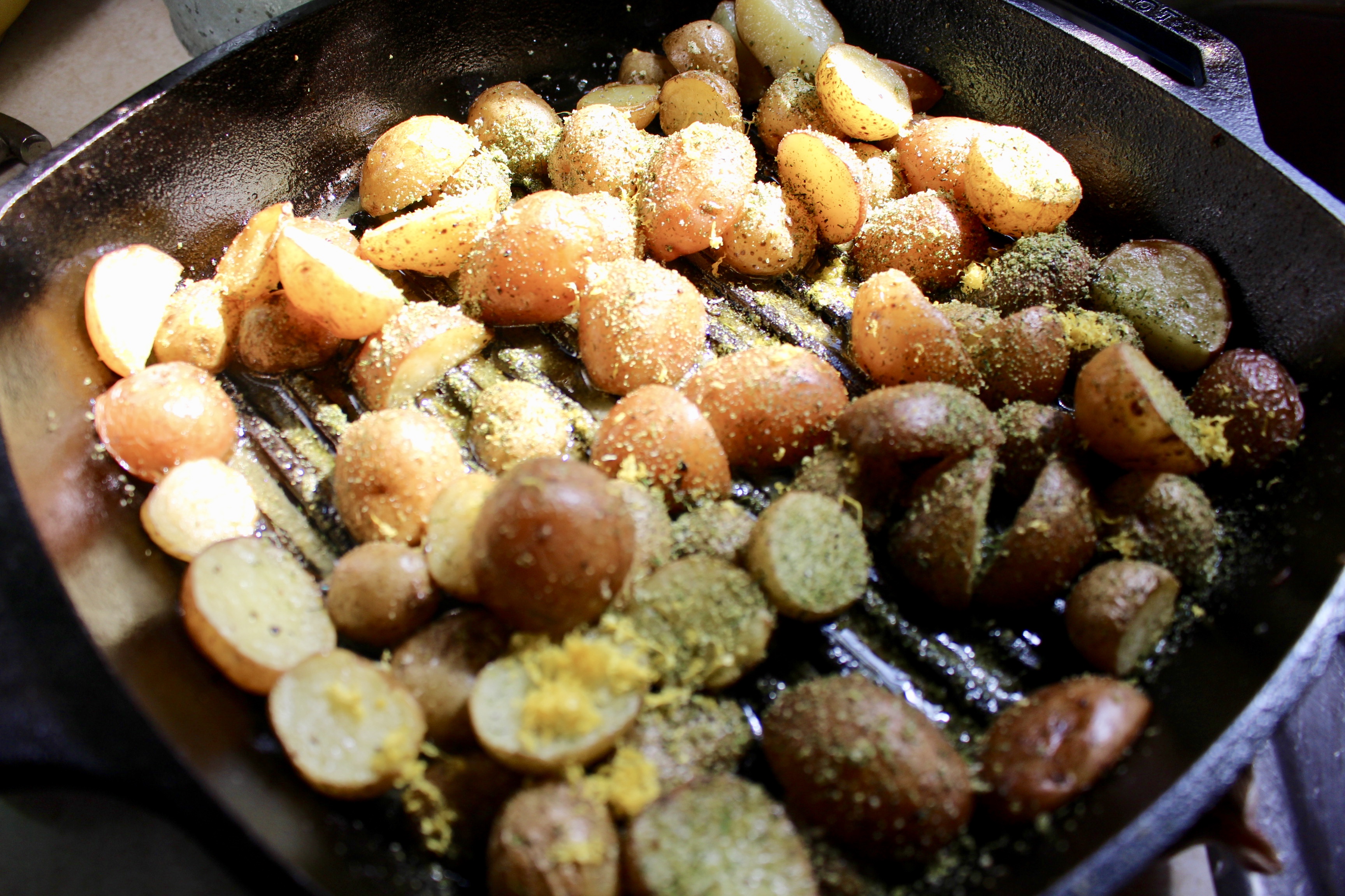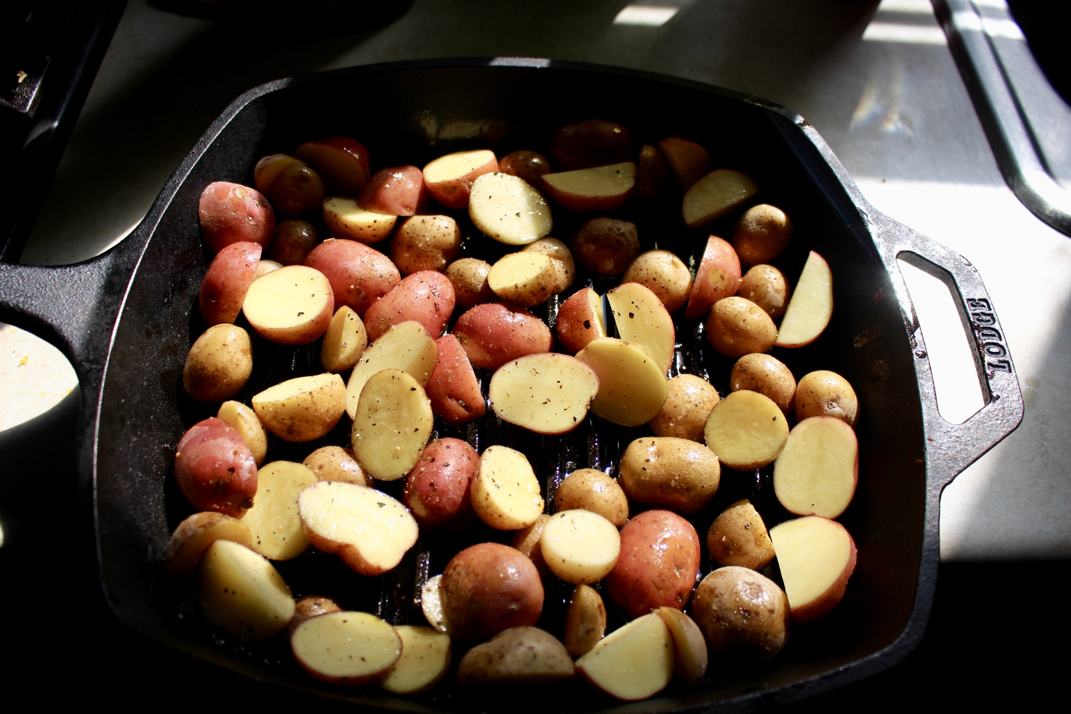 I like to use a cast iron pan for the potatoes. However, a baking dish works as well. Toss potatoes in oil, garlic, oregano and season with salt and pepper. Roast for 20 minutes (turn at the 20 minute mark). Add juice and zest and roast for an additional 3 minutes. Take out of the oven and let it rest.
