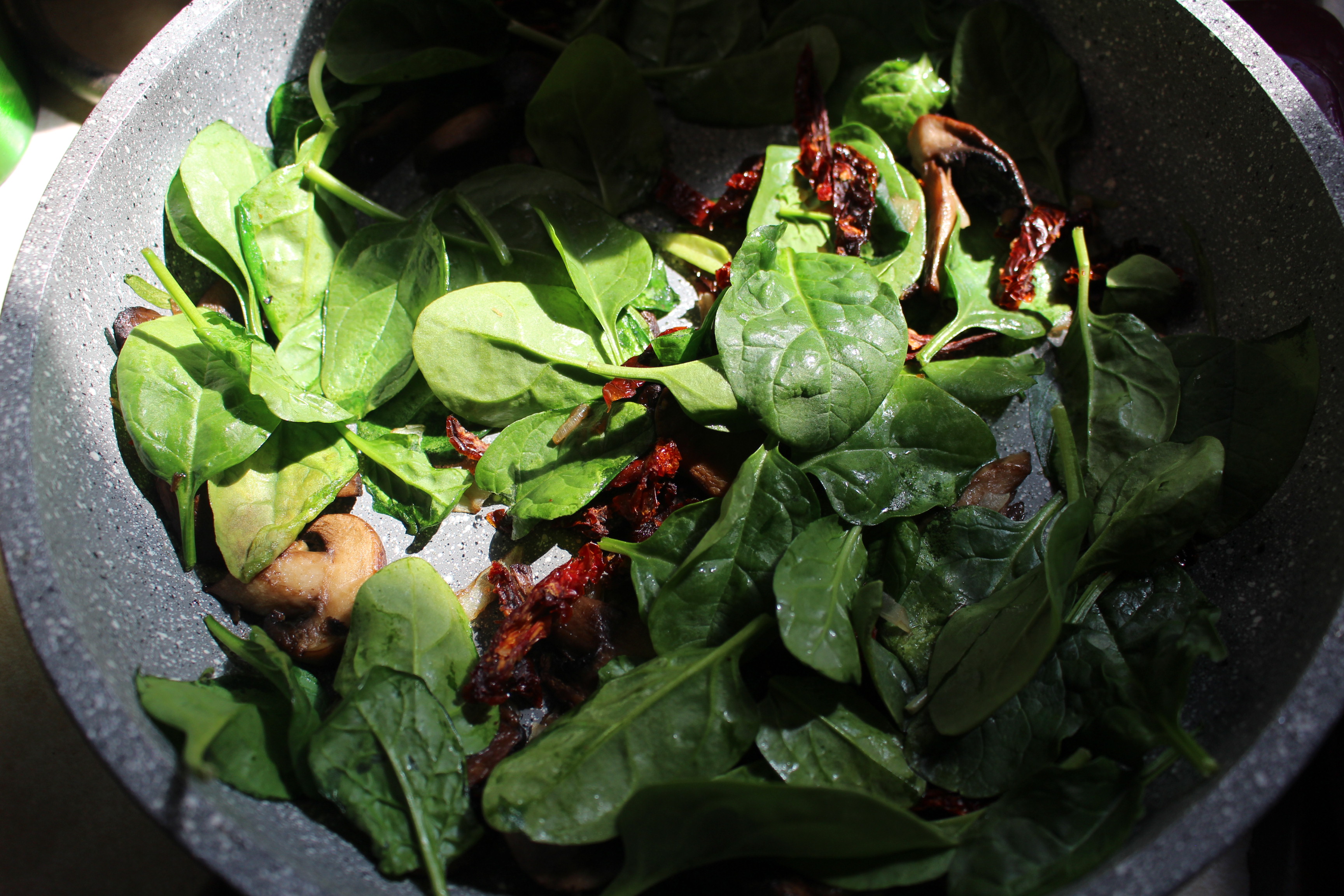 In a non-stick pan saute the asparagus, onion, bell pepper, mushrooms, and garlic with oil or butter. Cook for 3-5 minutes until soft. Add the greens and sun dried tomatoes and saute for 2-3 minutes until the greens are wilted.