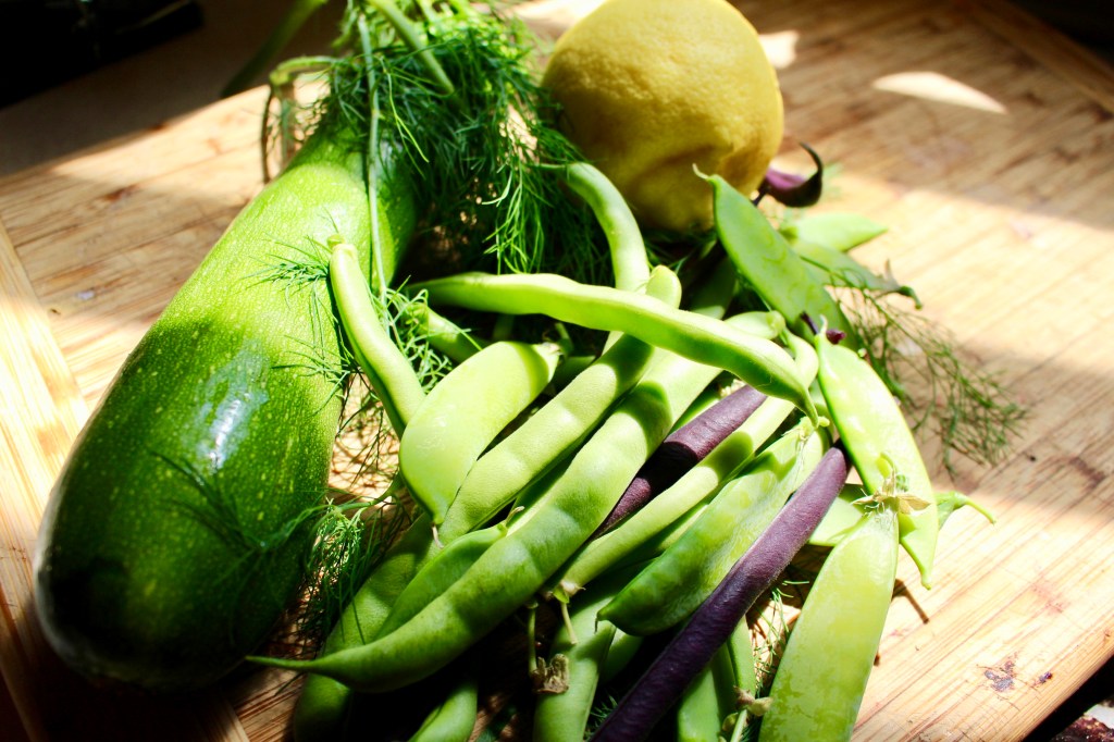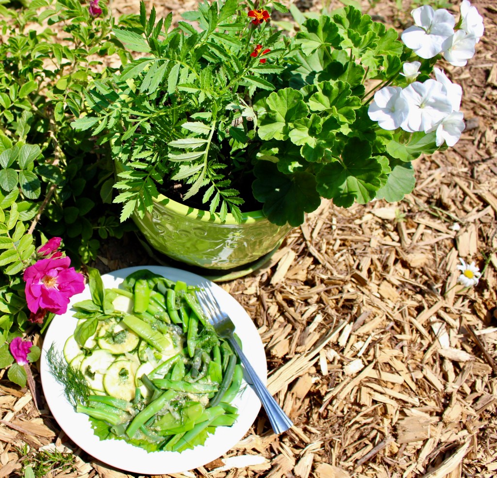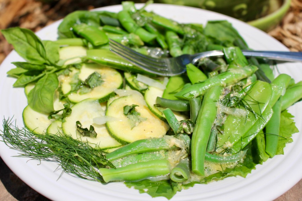 This afternoon I decided that I needed to stop and appreciate summer because it felt like it was slipping through my fingers. I went out to our hoop house and picked some garden goodness: beans, peas, spinach, zucchini, dill, basil, and mint. I whipped up a dijon vinaigrette dressing and enjoyed a lovely, sunshine filled plate.