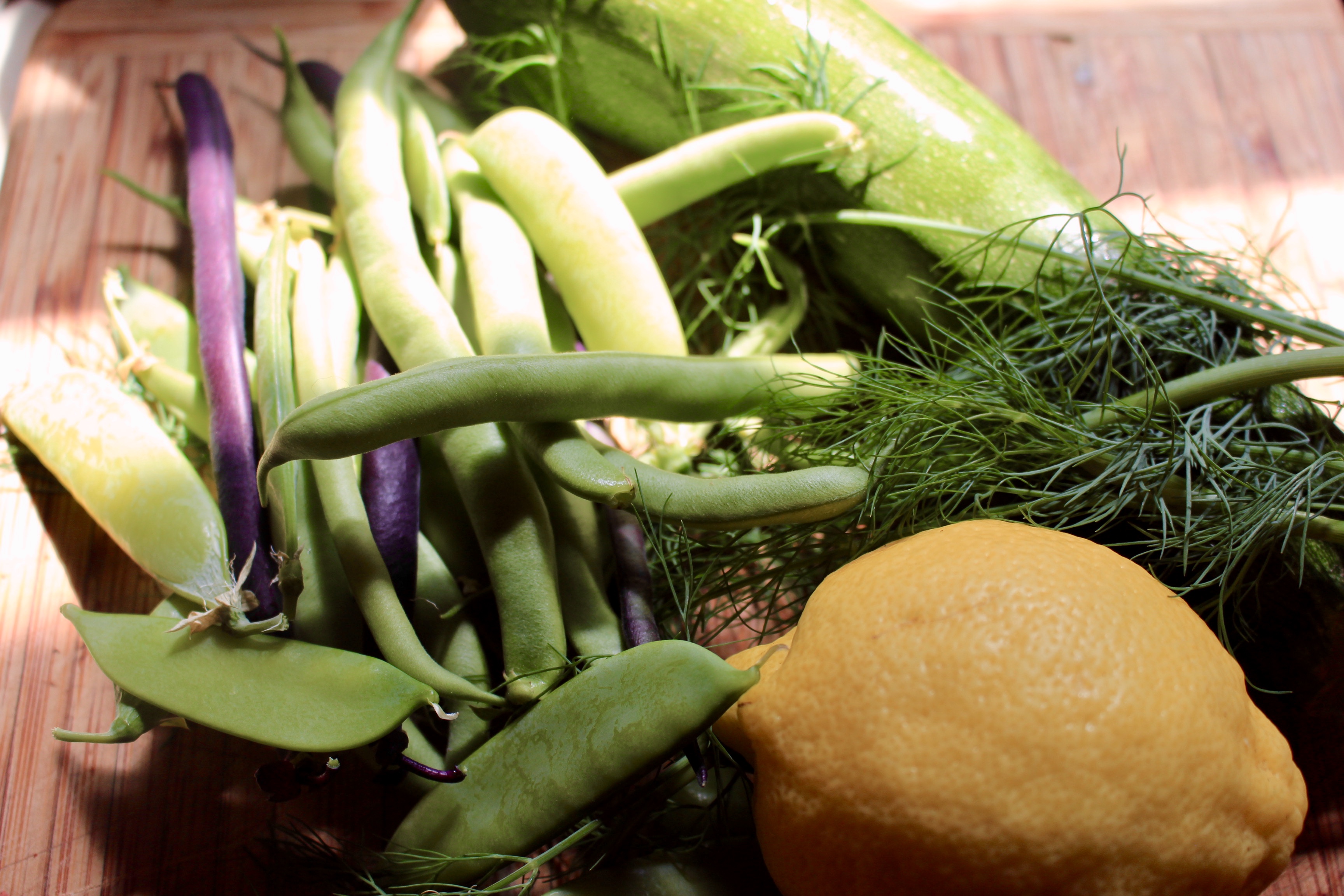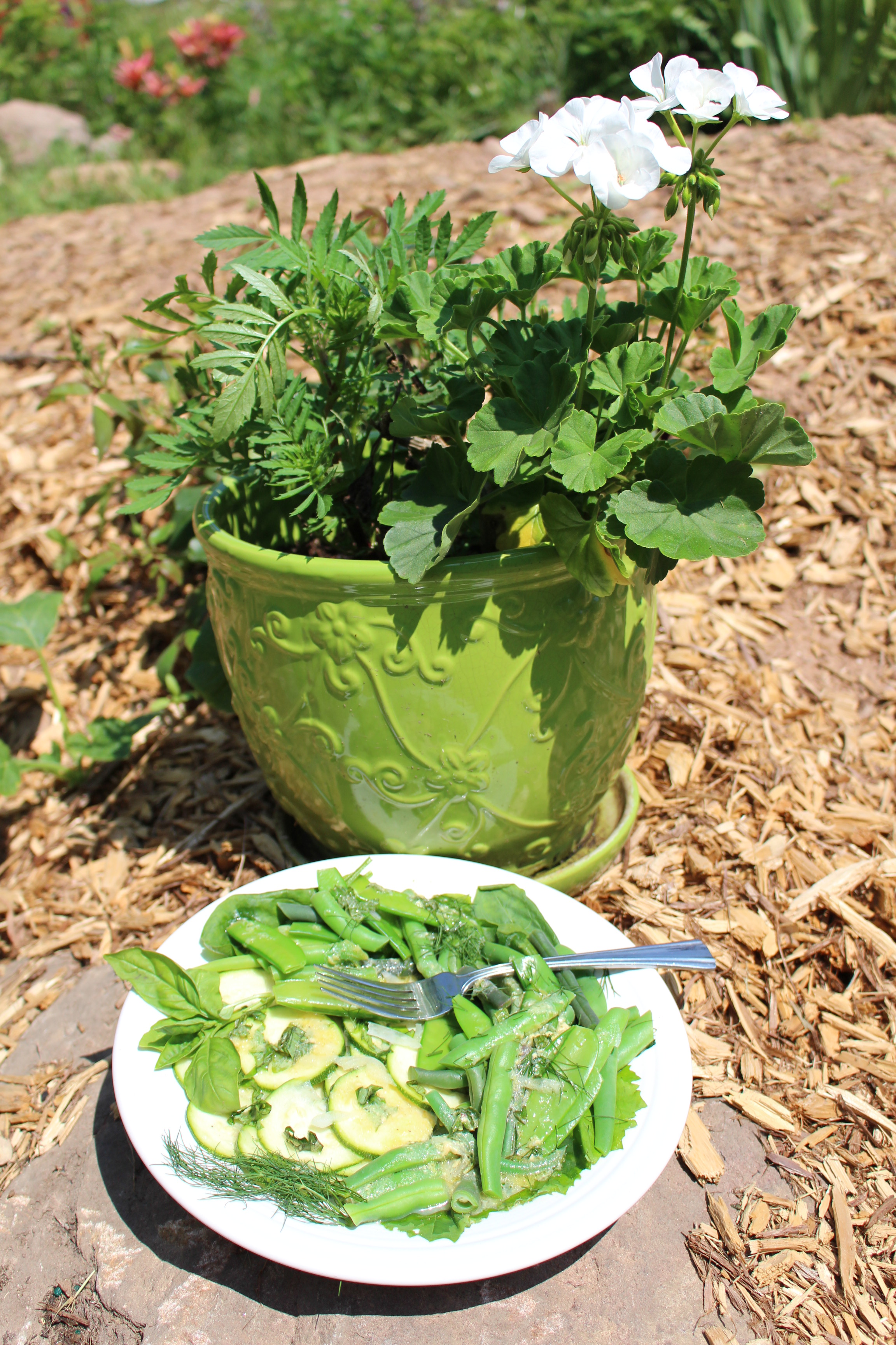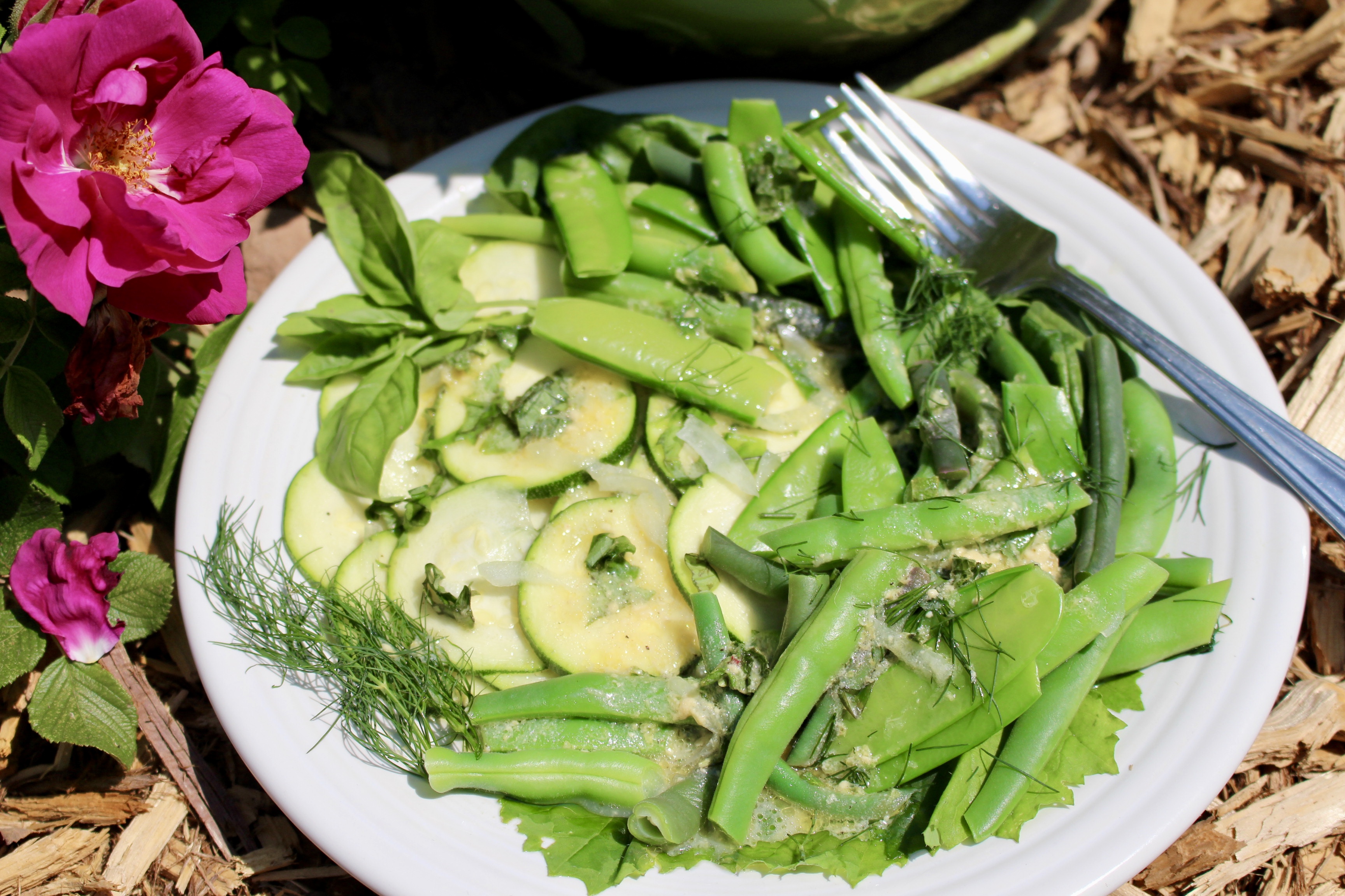 This afternoon I decided that I needed to stop and appreciate summer because it felt like it was slipping through my fingers. I went out to our hoop house and picked some garden goodness: beans, peas, spinach, zucchini, dill, basil, and mint. I whipped up a dijon vinaigrette dressing and enjoyed a lovely, sunshine filled plate.