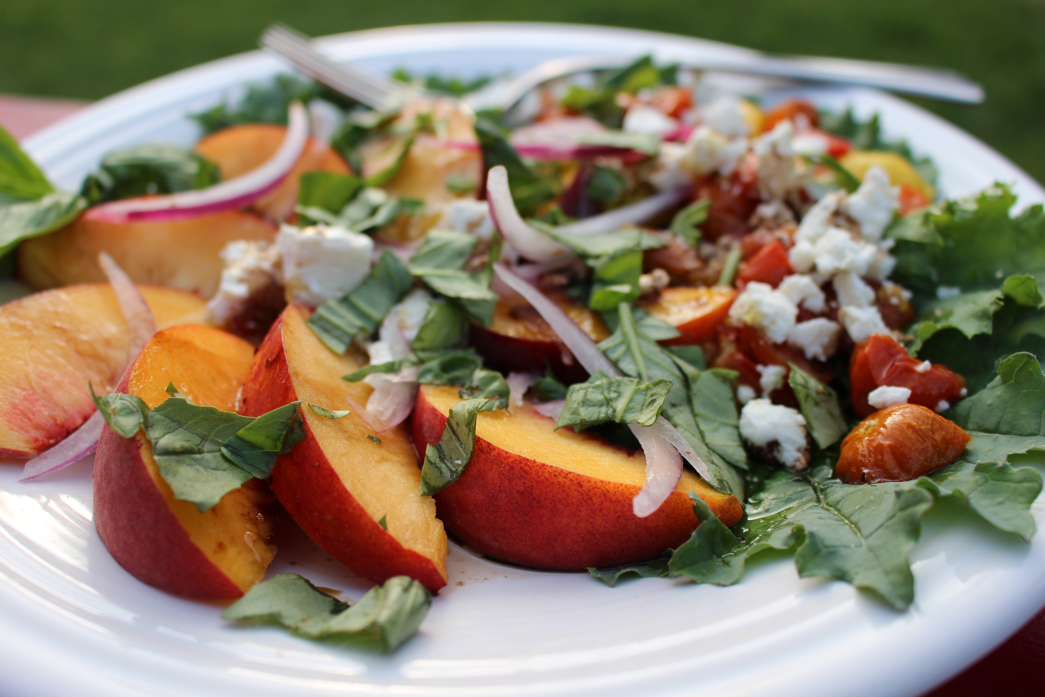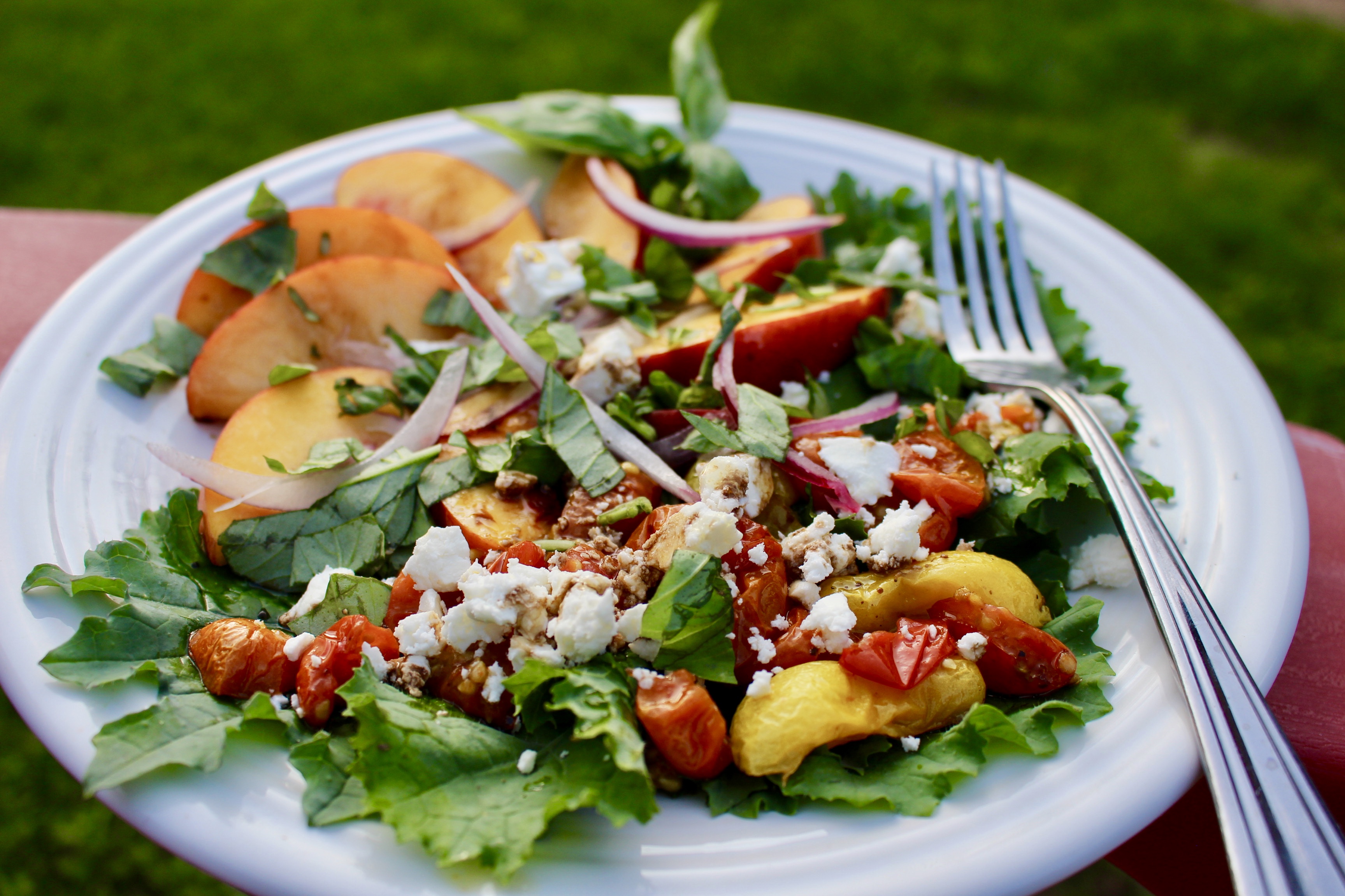 On a tin foil lined baking sheet, spread out the halved tomatoes. Drizzle with 1 Tablespoon of olive oil and season with salt and pepper. Roast for 20-30 minutes at 400 degrees (until the tomatoes blister). Plate up the kale, peach, and nectarine. In a small bowl add the balsamic vinegar, olive oil, salt, and pepper and mix.