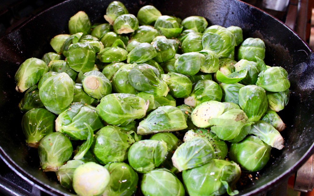 Heat oven to 425 while you prepare the Brussels sprouts. Warm up your pan and put in the bacon grease. Cut sprouts in ½ and put in the pan – cut side down. Sprinkle with salt, pepper, and garlic powder.