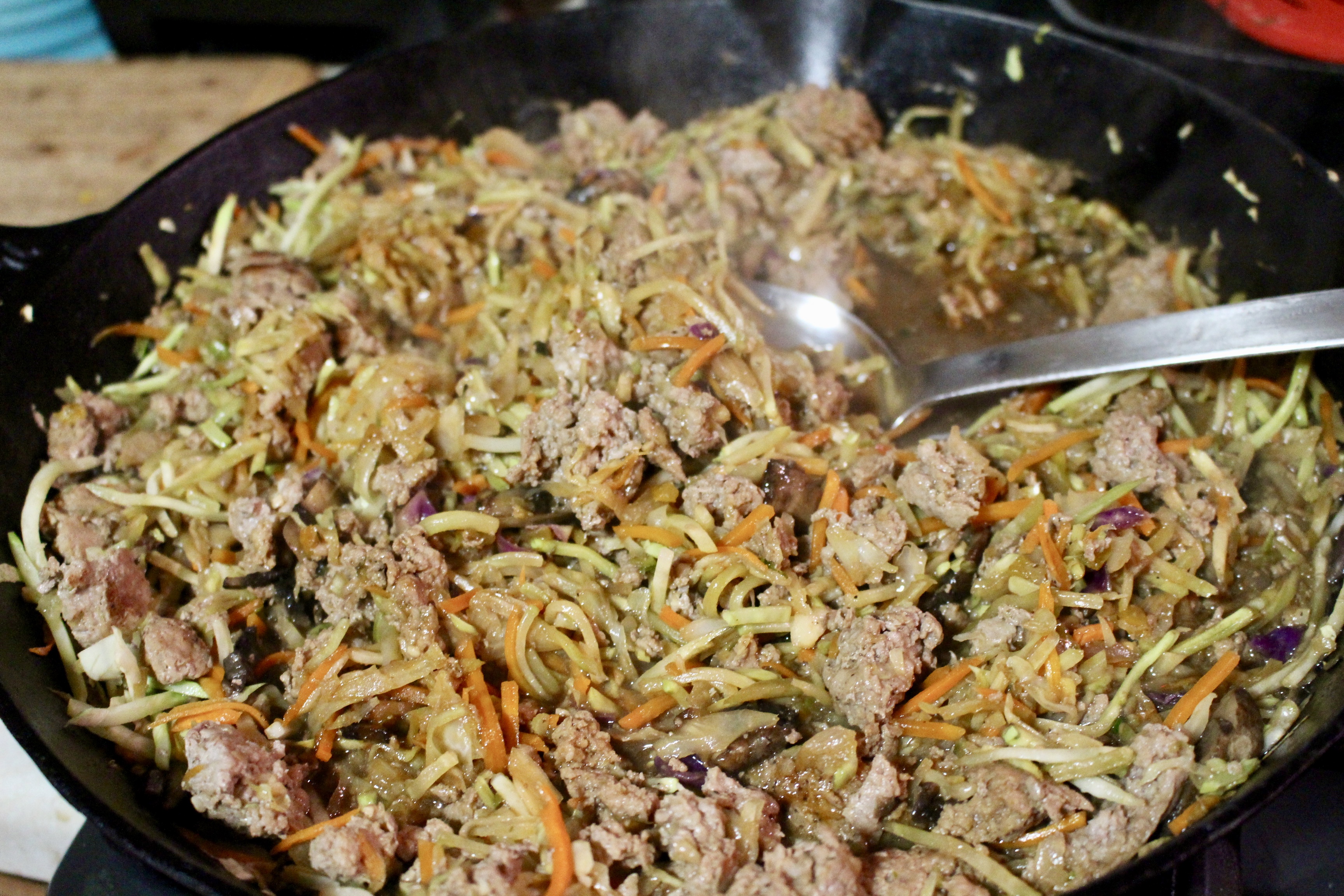 Saute the cabbage, broccoli slaw, bell pepper, and mushrooms with 2 Tablespoons of sesame oil (I like to use a large cast iron pan). Add the ginger and cook for 4-5 minutes. Add the ground pork along with the soy sauce, hoisin sauce, and rice vinegar. Cook for an additional 8-10 minutes.