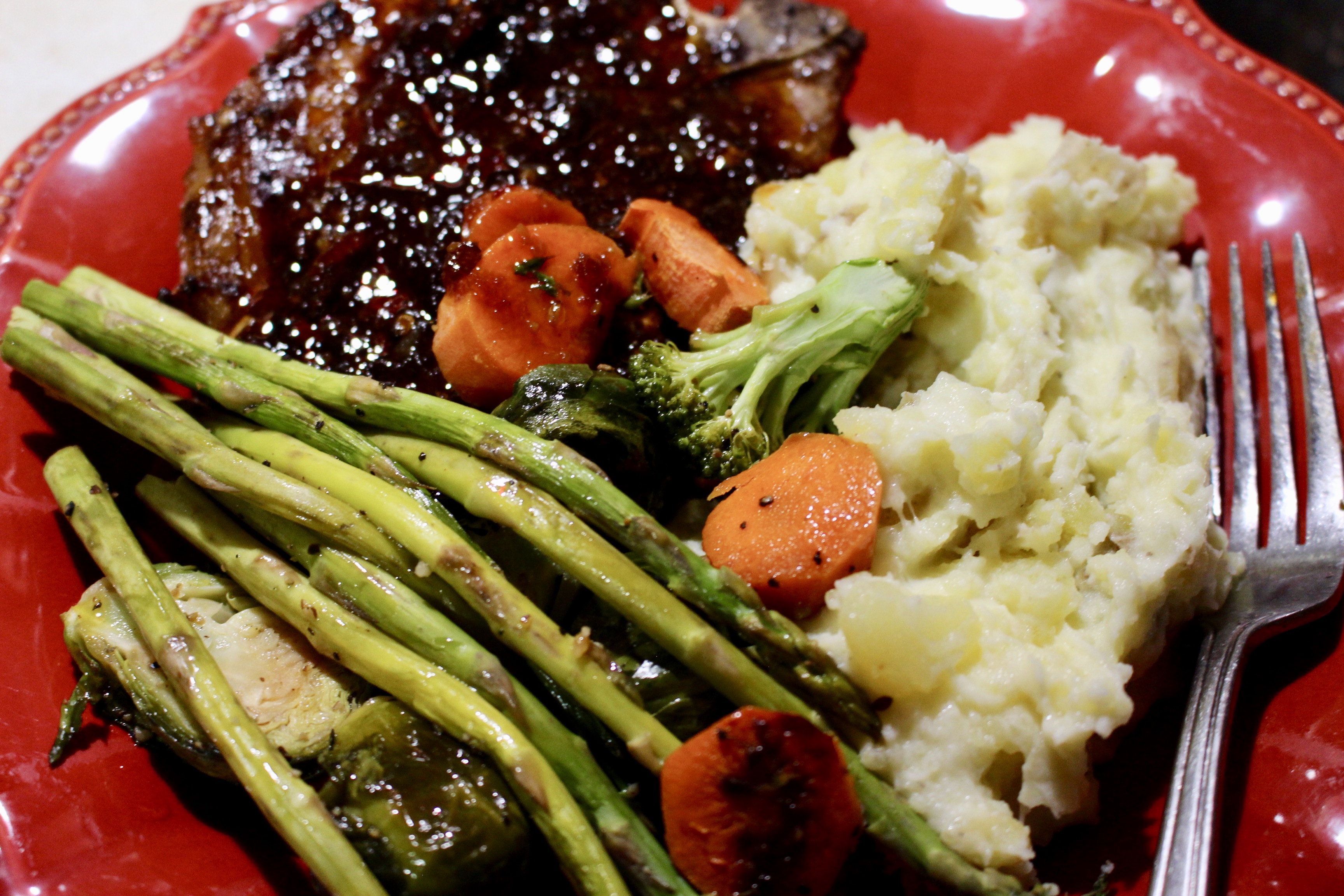 This recipe would also be great with chicken breast. I made a side of roasted asparagus, Brussels sprouts, broccoli, and carrots with rustic mashed Yukon gold potatoes. Searing the meat first makes the chops moist and the sauce is incredible. It was a wonderful feast for a cold winter night. However, it could easily translate to summer dinners as well. Imagine starting the cooking process on the grill and finishing with the glaze. Add a scoop of pineapple sorbet and a slice of watermelon and you have a perfect meal.