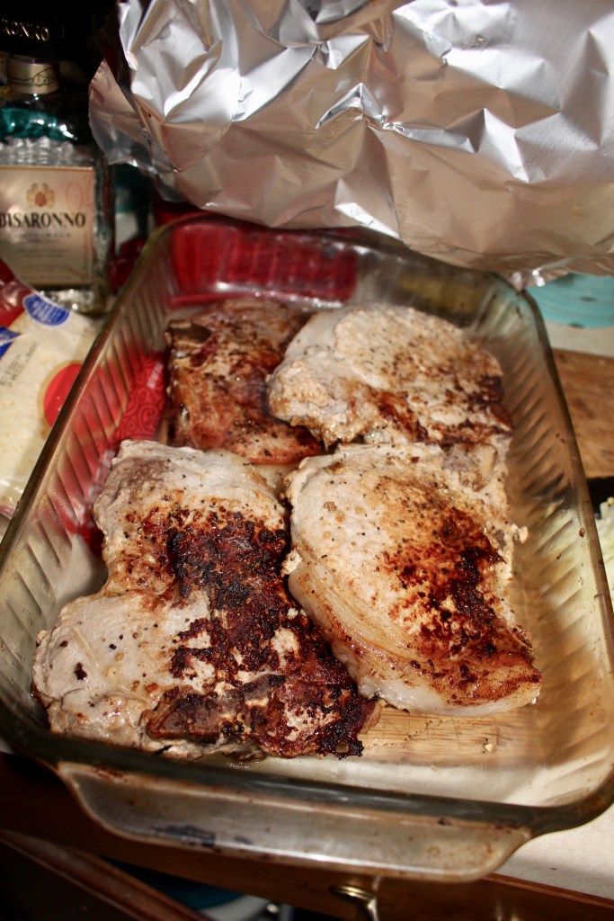 Heat oven to 425 degrees. Season both sides of the pork chops with salt, pepper, and garlic salt. Add a couple of Tablespoons of butter to a large cast iron pan (Since I was making 6 chops, I had to use two pans) and heat until butter starts to brown. Add the pork chops and sear each side for 4 minutes. Take the chops out and place in a pan or dish.