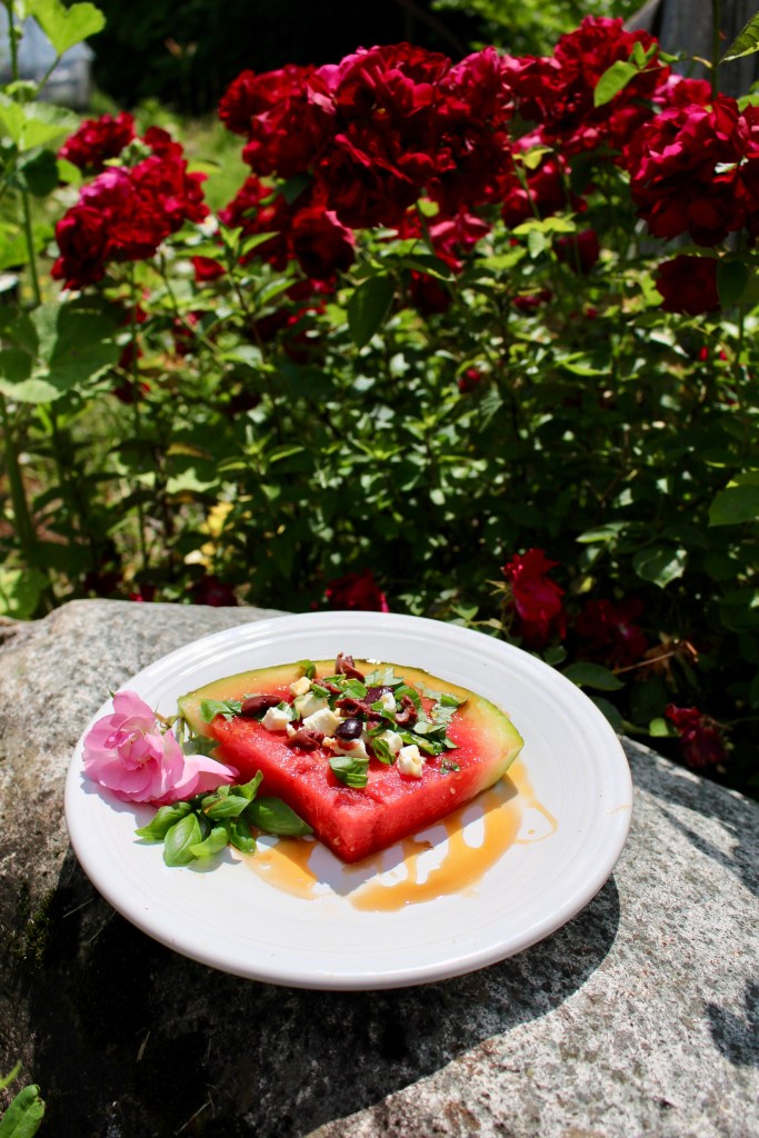 As I contemplated this month’s recipe I wanted to come up with something that was the epitome of summer. A meal that was simple and fresh and that does not require cooking. Certain ingredients come to mind: luscious strawberries, ripe garden tomatoes, and rosey peaches are a few. However, nothing is as iconic as a slice of cold watermelon on a hot summer day. At our house we love to eat watermelon poolside and our chickens even get to enjoy slices of melon when the temperature soars.