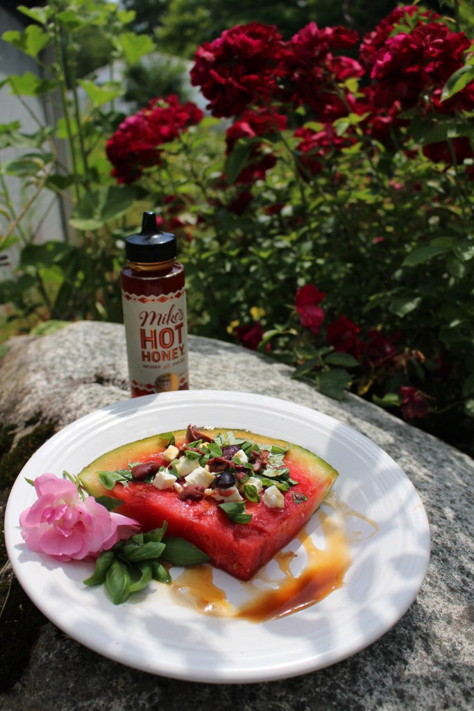You could cube up the watermelon and make a salad, or as I decided to do, cut the watermelon in slices and eat in wedges with the ingredients piled and drizzled on top. The wedges would make a charming presentation on a large platter for a gathering. However, if you decide to make it into a salad you could also add fresh kale, cucumber, and make a dressing out of the honey and vinegar. Prosciutto and pine nuts would also make a great addition to this recipe. However, I kept mine simple and it was heavenly!