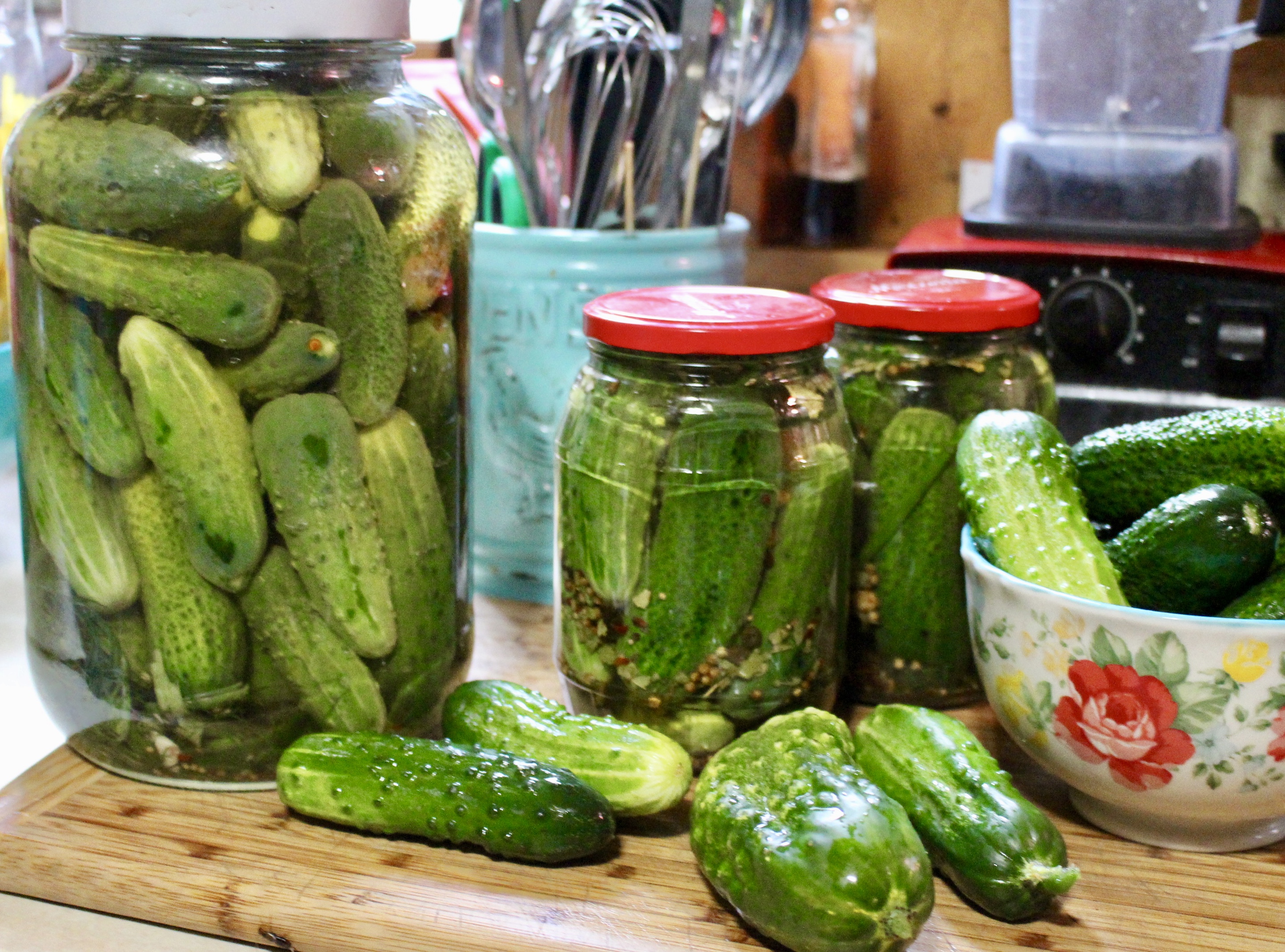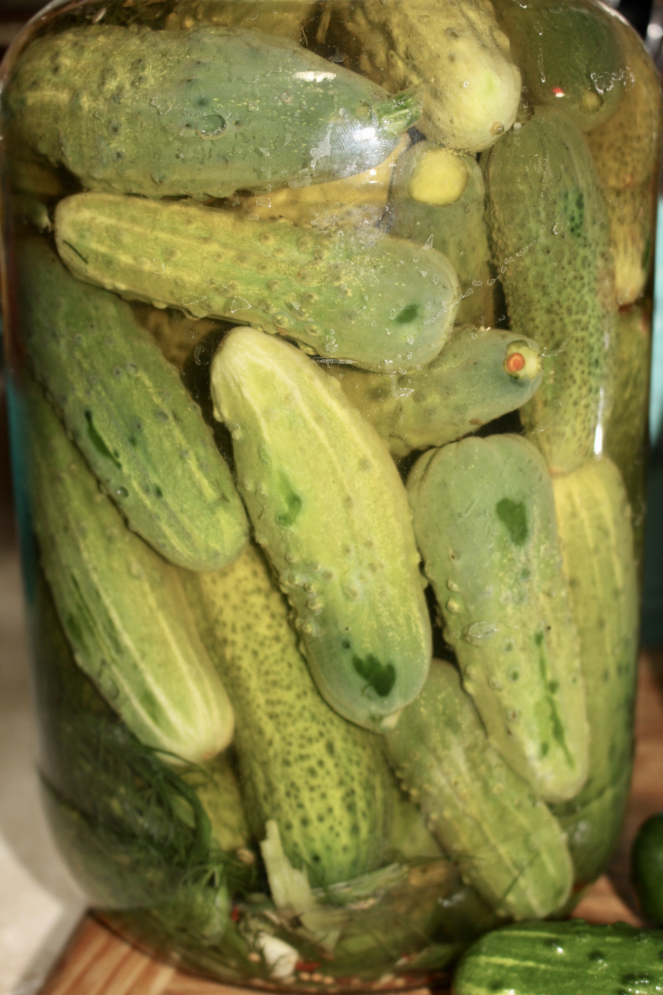 Once the cucumbers are firmly packed, fill the jar with the boiling brine, leaving about ¾ inch of head room at the top. Put on a tight fitting lid. Let sit on your counter for a couple of days, or place directly into the refrigerator after they have cooled. If you are only making a jar or two and find that you have leftover brine, you can store it in the refrigerator.