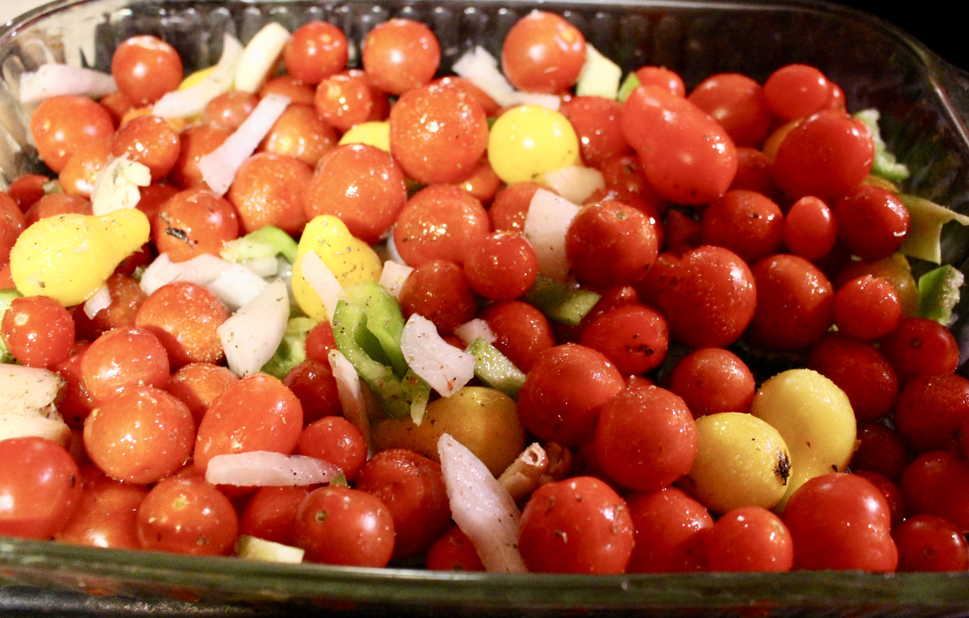 Toss the tomatoes in a Pyrex baking dish (I do not cut the cherry/grape/pear tomatoes). Add a drizzle of olive oil, chopped celery, onion, bell pepper, crushed garlic, basil, oregano, salt, and pepper. You can also add a little sugar to cut the acid.