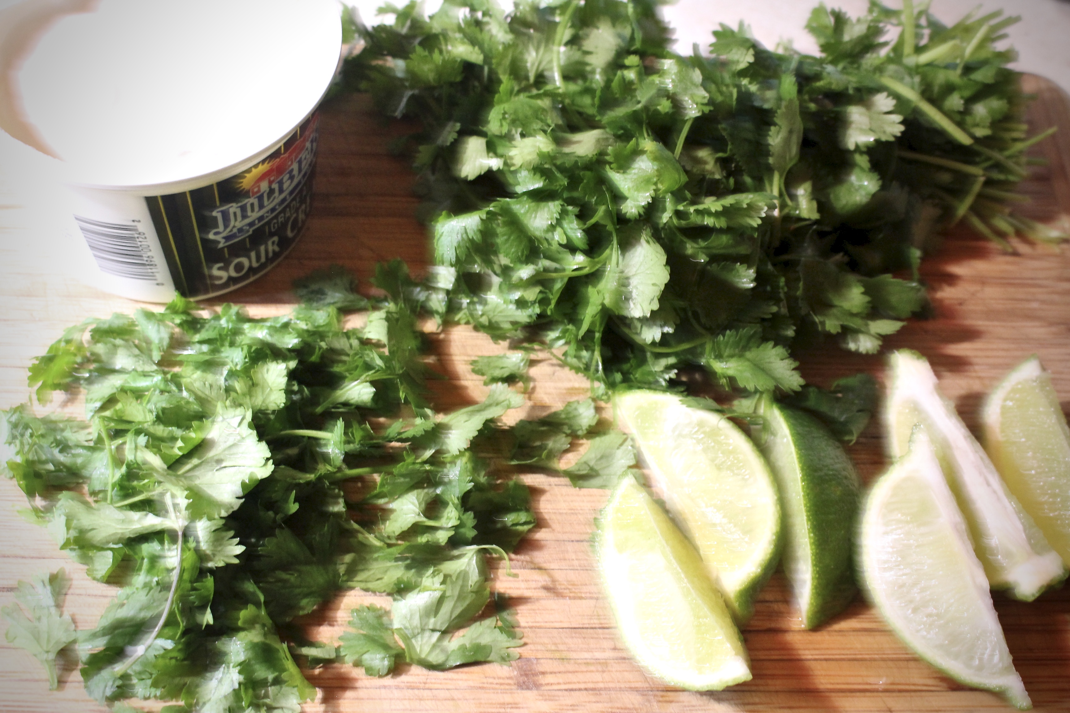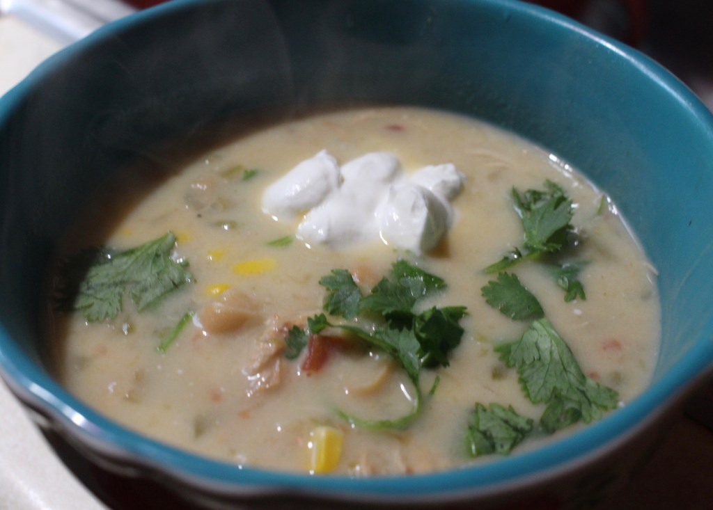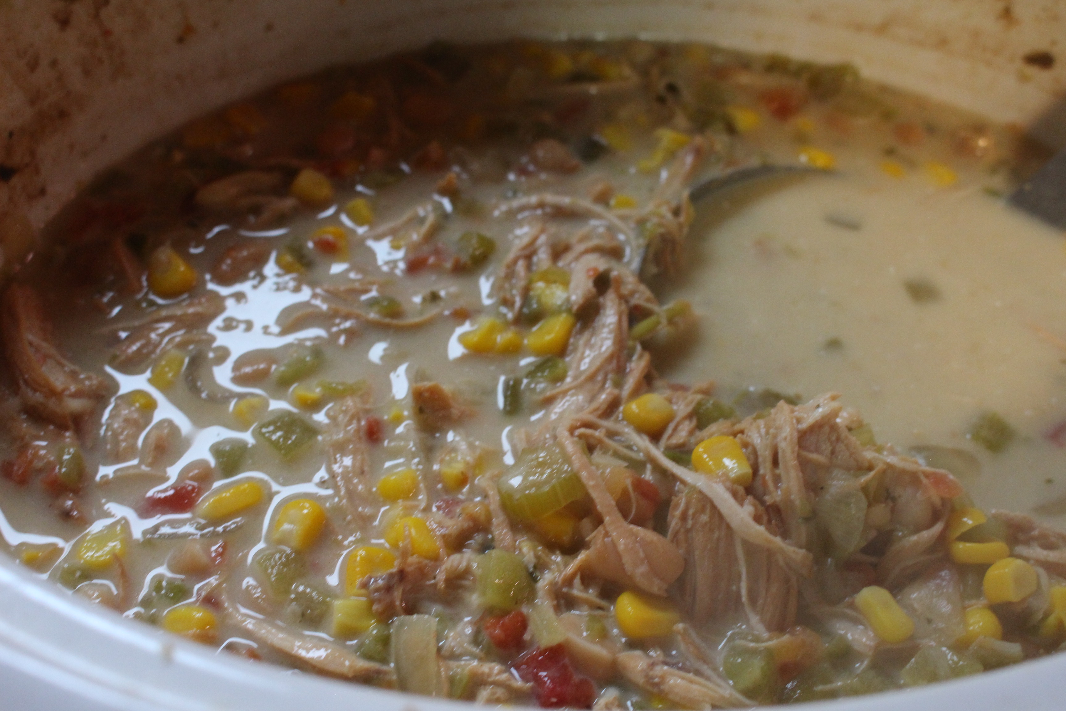 *3 Cups of roasted chicken (if you are using breasts – 1 pound) *8 Cups of chicken stock/broth (you can reduce this if you want the chili to be thicker) *2 Cans of white beans *1 Can of corn *½ Large onion – chopped *3 Ribs of celery – chopped *½ Green bell pepper *3 fresh chopped jalapeno (I left some of the seeds for heat) *2 Tablespoons of minced garlic *1 Can of Rotel tomatoes with lime and cilantro *2 Cans of green chilis *2 Tablespoons of ranch seasoning *1 Tablespoon of cumin (I added more to taste) *1 Tablespoon of coriander (I added more to taste) *Salt and pepper to taste *3 Tablespoons of flour (to thicken) *1 block of cream cheese *Fresh Limes – cut in wedges (to serve with) *Chopped cilantro (to garnish) *Sour cream to garnish *Optional – tortilla chips