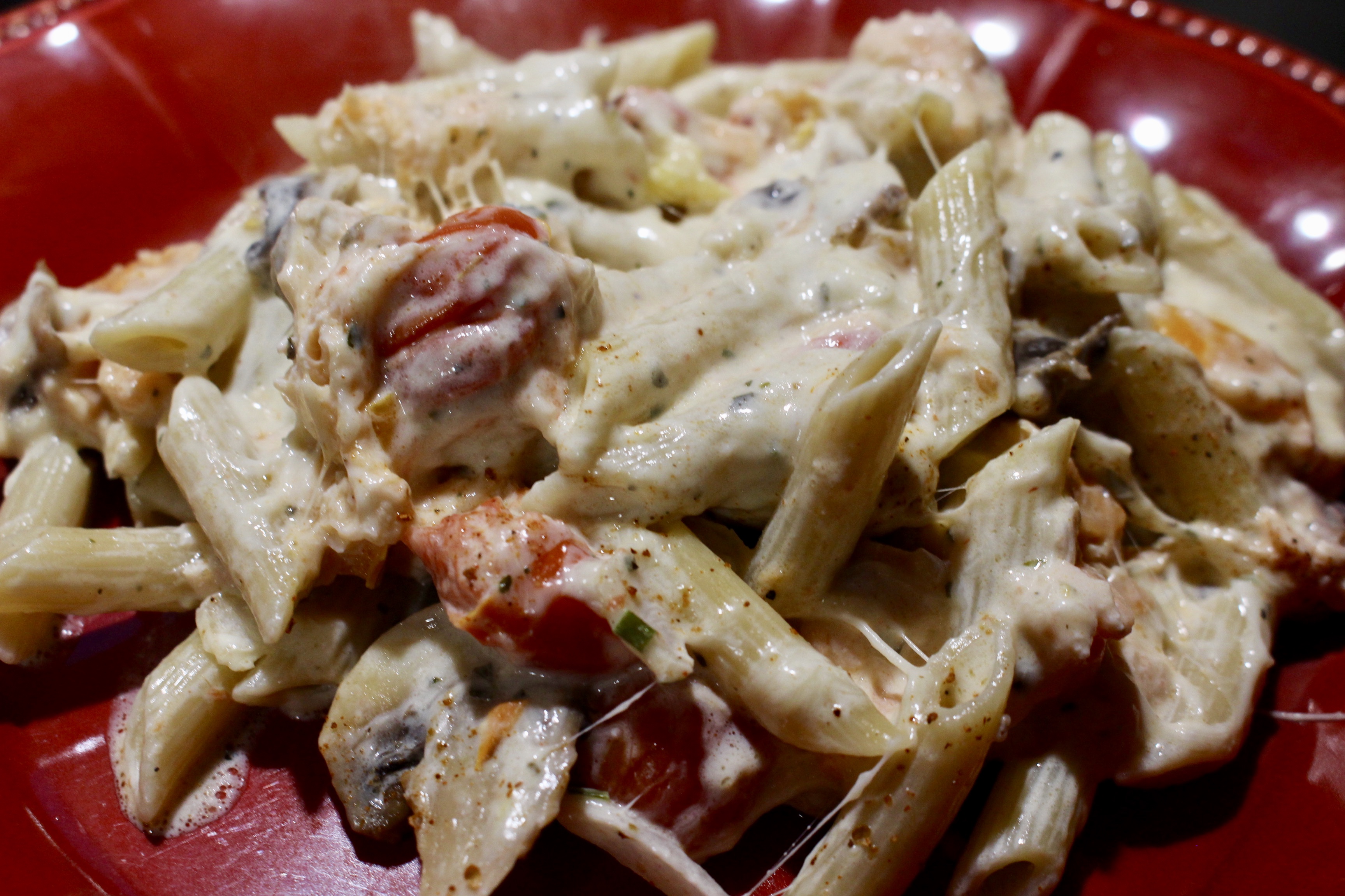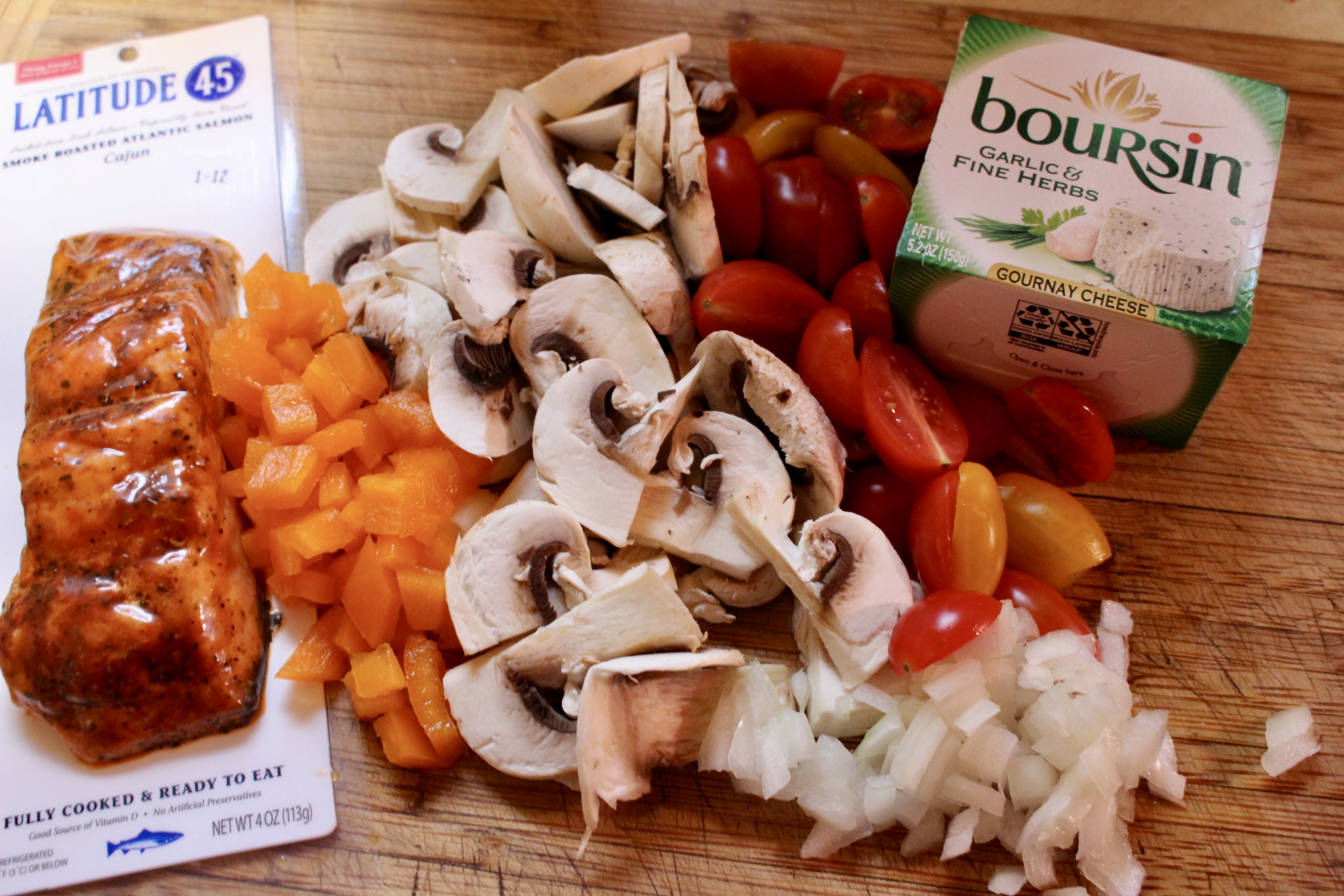 *1 package of Boursin cheese *1 package of penne pasta (cooked) *1/2 pint of cherry tomatoes (cut in ½) *½ container of sliced mushrooms *¼ cup of chopped onion *Tablespoon of minced garlic *2 Tablespoons of olive oil *¼ cup of chopped bell pepper (I used orange) *Tablespoon Italian seasoning *¼ cup of heavy cream *¼ cup of pasta water (reserved from the pasta) *½ cup of mozzarella cheese *2 4 ounce packages of Smoked salmon (I used cajun flavored. I find at Meijers by the fish counter) *Salt and pepper to taste