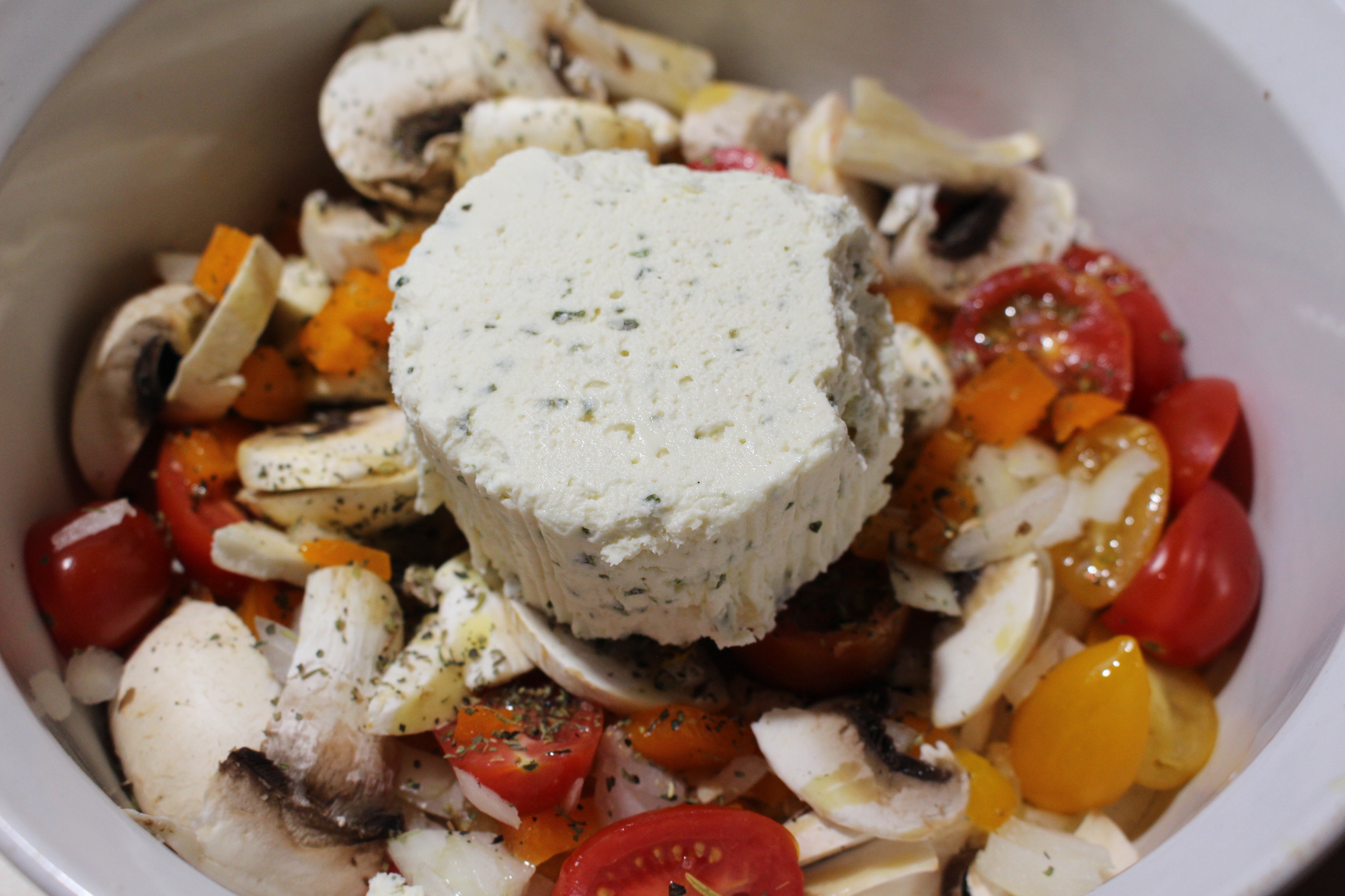 Preheat your oven to 425. In a baking dish add the tomatoes, mushrooms, onion, garlic, bell pepper, Italian seasoning, olive oil, and a dash of salt and pepper. In the middle add your Boursin Cheese (or the feta or goat cheese). Bake for 25 minutes.