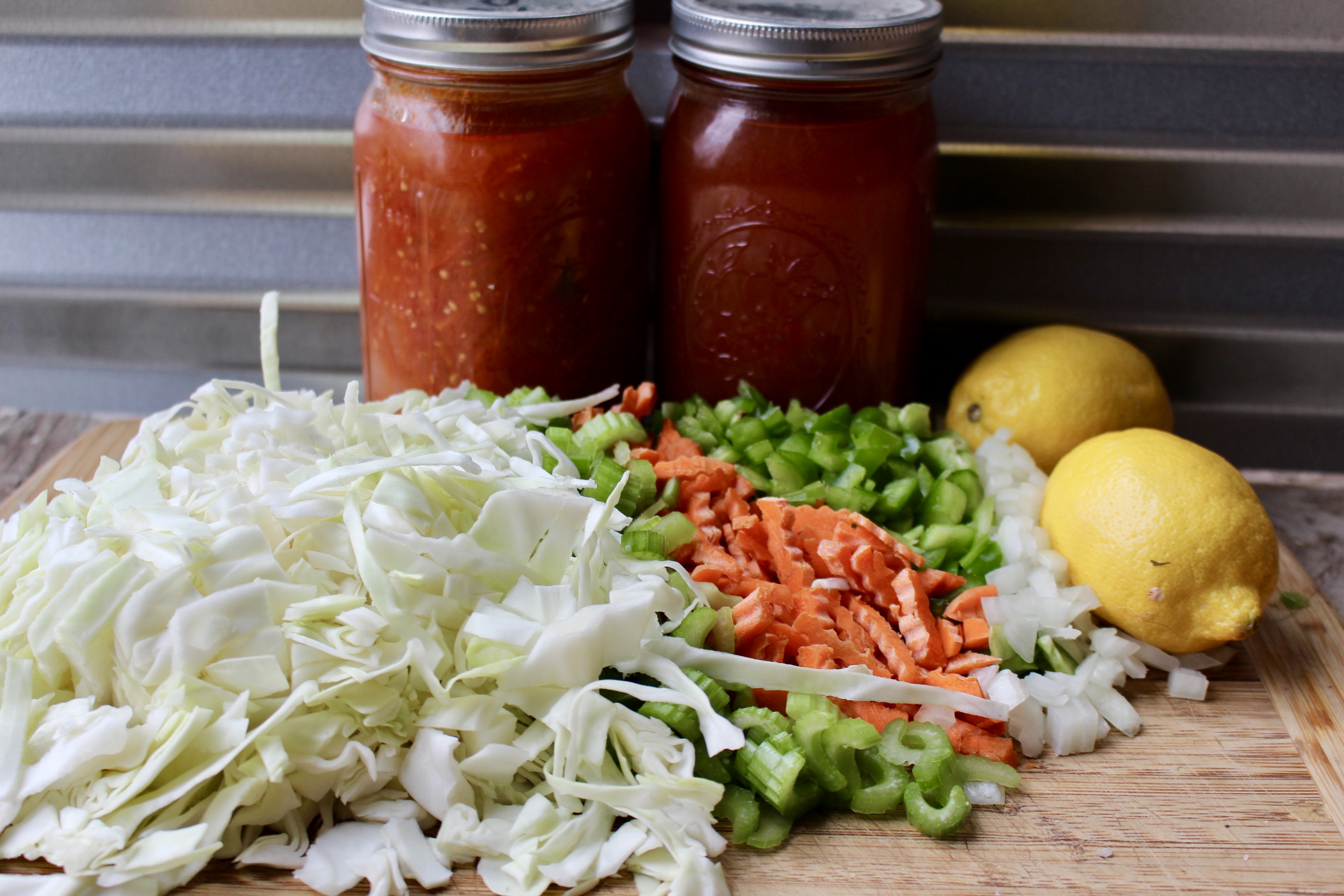 *4 cups of finely chopped cabbage (the cabbage cooks down) *1 medium chopped onion *3 ribs of chopped celery *2 chopped bell peppers (I use one green and one red or yellow. I really like the flavor that the bell peppers bring to the soup) *1 cup of chopped carrots *6 cups of tomato juice *4 cups of canned tomatoes *2 Tablespoons of minced garlic *1 Tablespoon of olive oil (or your cooking oil of choice) *Salt and pepper to taste *Lemon juice to taste (when I use fresh lemons, I use two and always use the zest. The more lemon the better.) *Worcestershire sauce to taste *Hot sauce (Optional. I recommend adding it to your cup or bowl before serving. If you like some heat you could also add a diced jalapeno pepper to the pot)