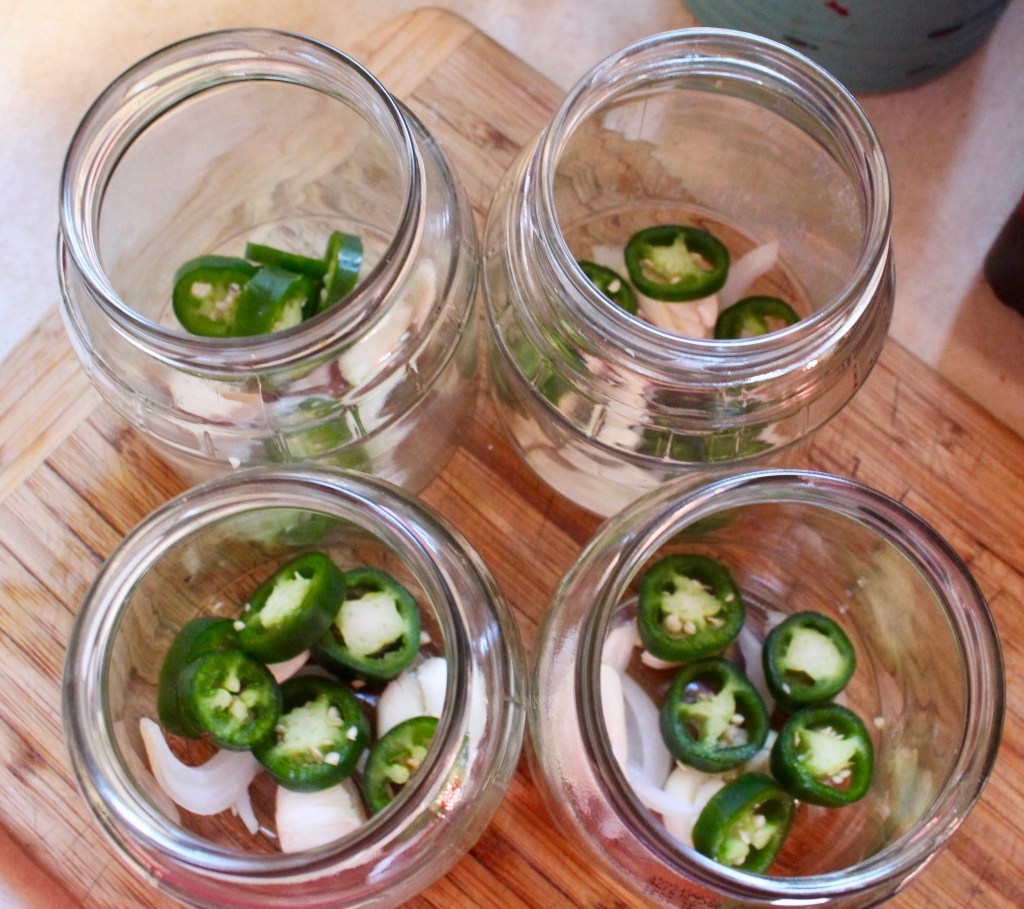 Make sure you sanitize your jars. In the bottom of the four jars I divide up the slices of jalapeno, onion, garlic cloves, and dill.
