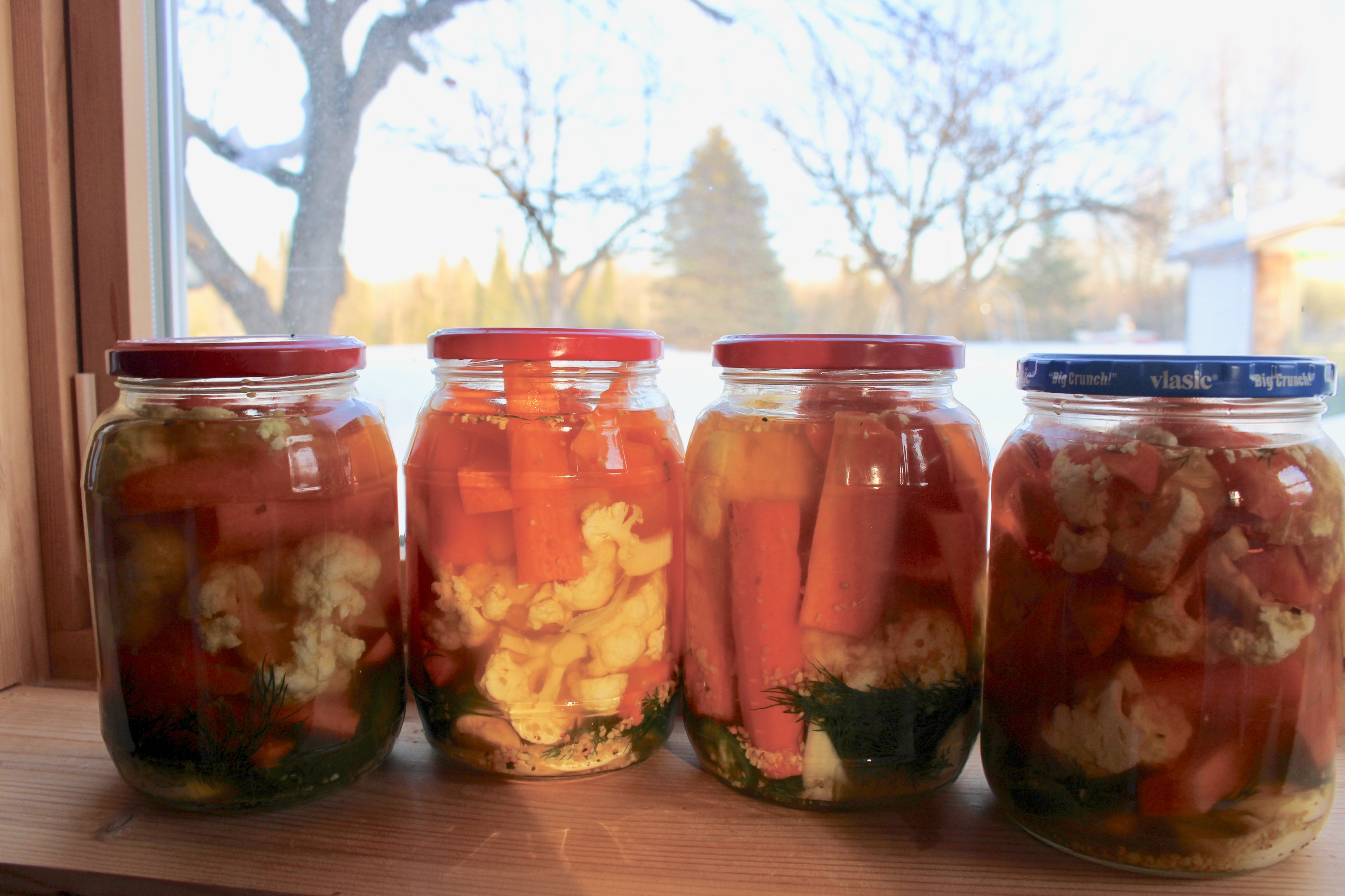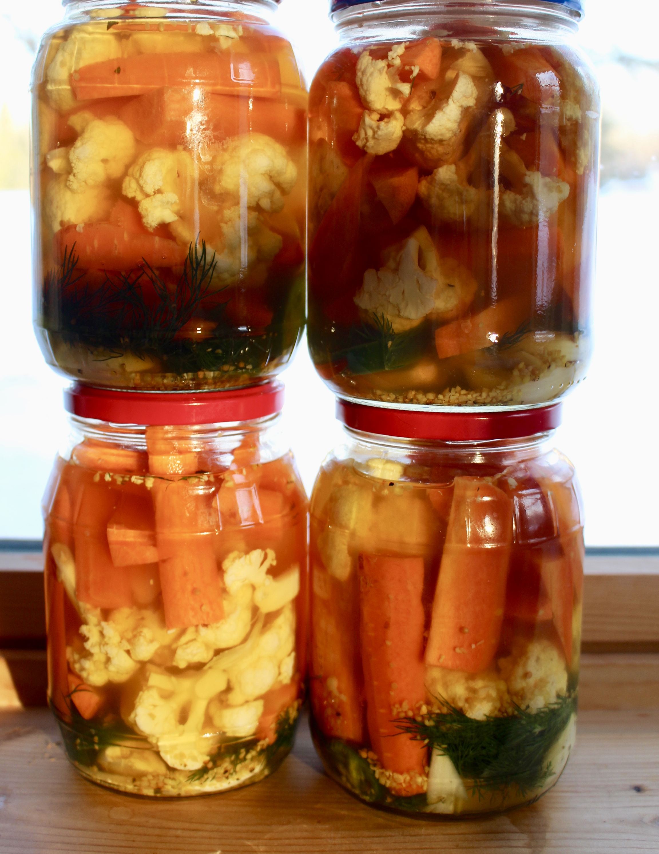 Then pack the jars with the vegetables. I combined both the carrots and cauliflower, but you can keep them separate.