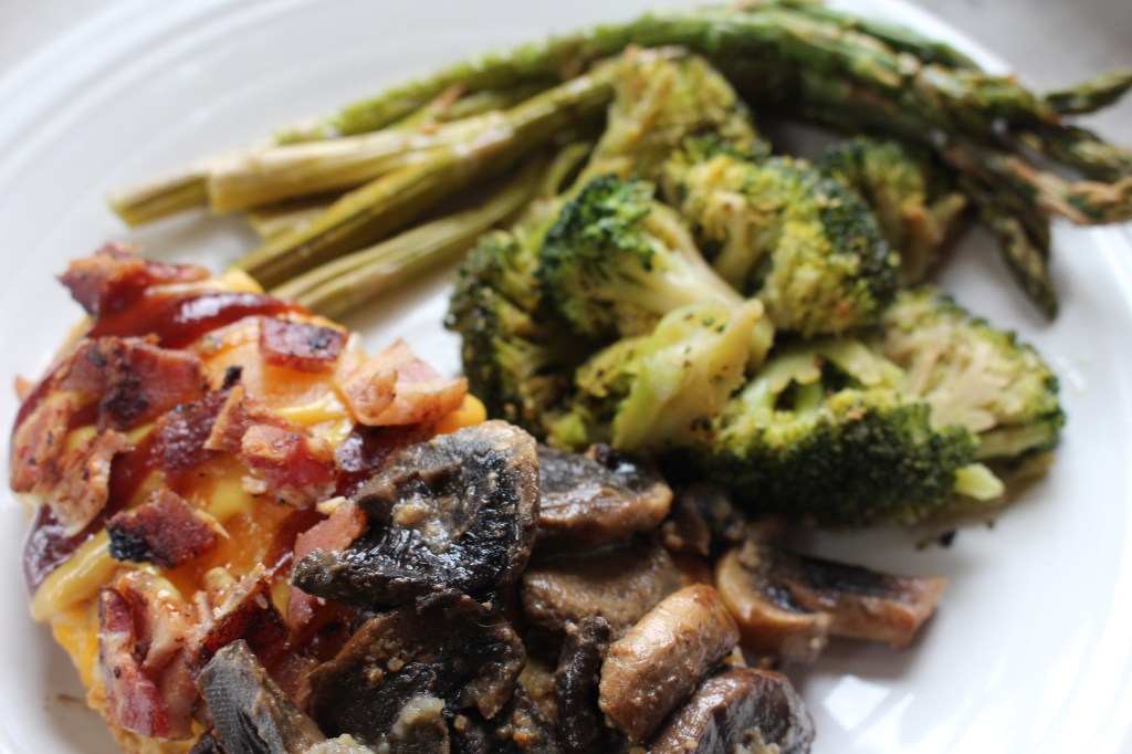 When you take the chicken out of the oven, top each piece with ¼ cup of cheese and melt until lightly browned under the broiler. When the cheese is done, drizzle each piece of chicken with honey mustard sauce, BBQ sauce, mushrooms, and crumbles of bacon. In the summer, when I have fresh chives, I will add a sprinkle.