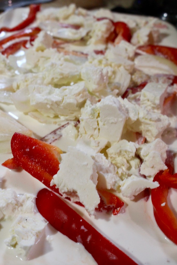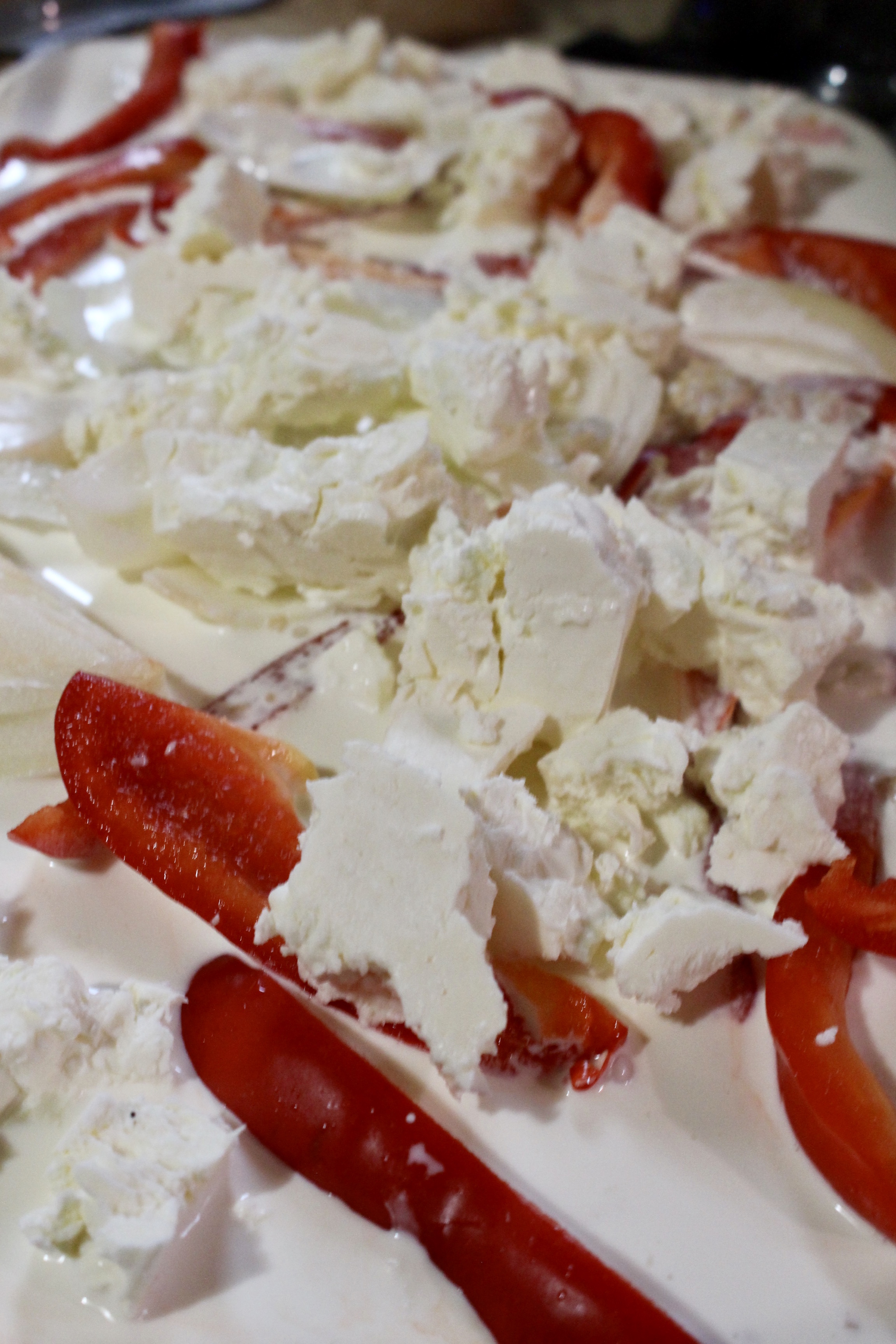 Preheat your oven to 350. Spray a large baking dish with cooking spray, or coat in olive oil. In the middle of the baking dish place the block of feta, onion, mushrooms, garlic, and one cup of cream.. Bake for 20 minutes.
