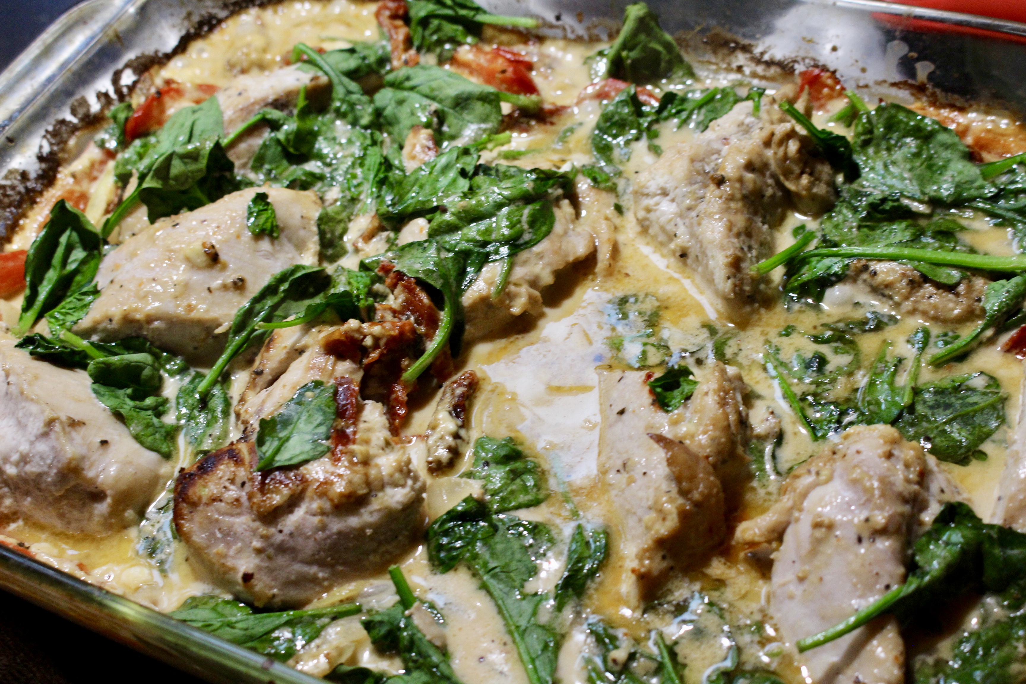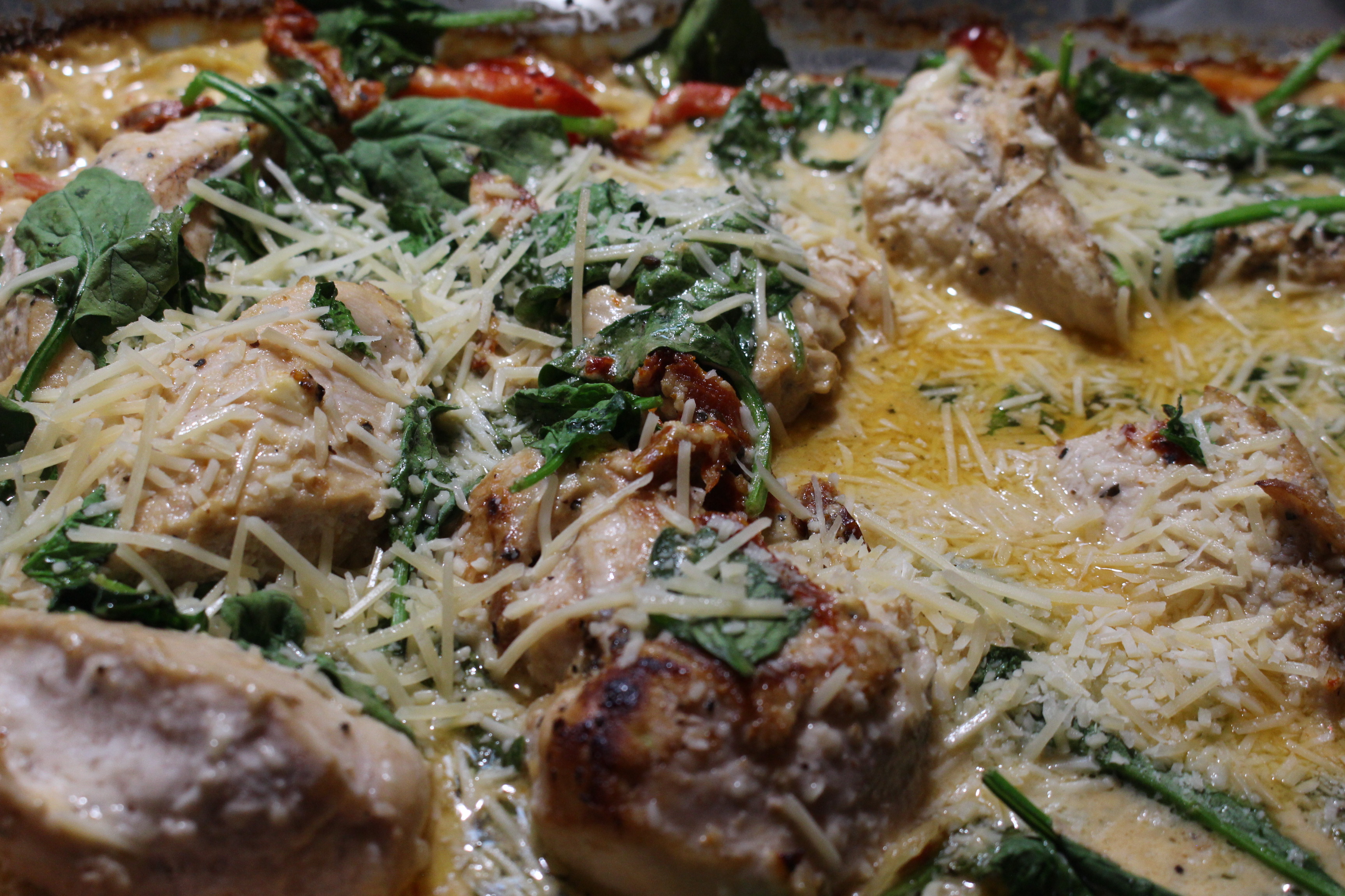 Take your baking dish out of the oven and stir. The feta should be soft enough to incorporate well. Add the other cup of cream, mozzarella, kalamata olives, spinach, and sun dried tomatoes. Stir and add the chicken breasts and cover with the cheese sauce. Add parmesan cheese to the top. Bake for an additional 20 minutes, or until the chicken is done through.